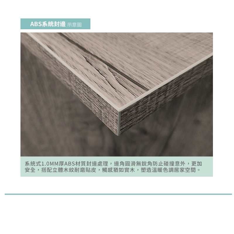 搭配1.0mm系統式ABS封邊技術處理,導圓邊角設計,質感細膩安全不刮手!