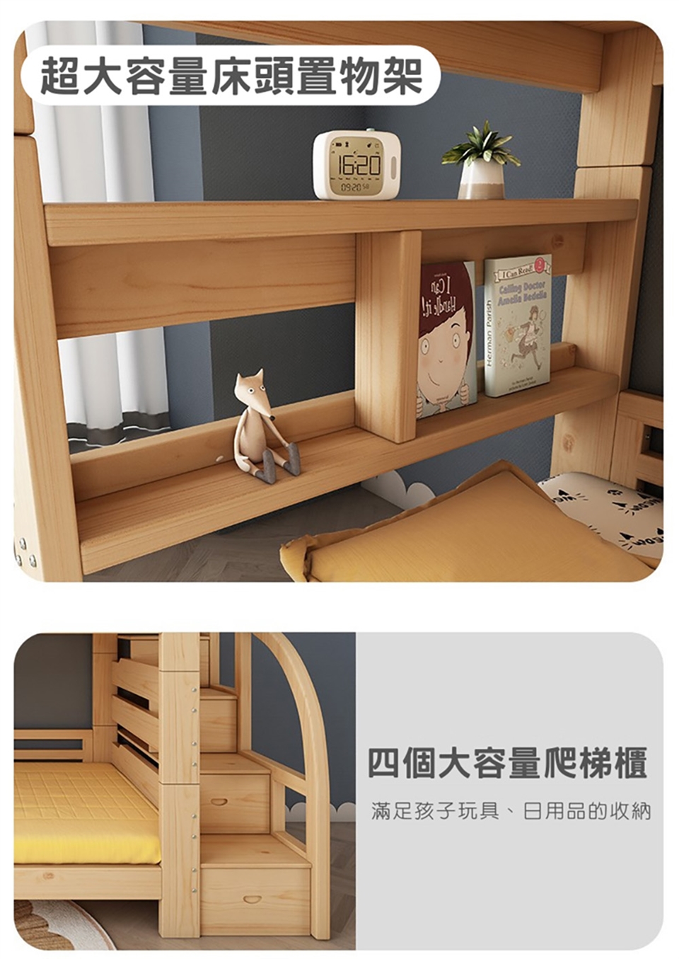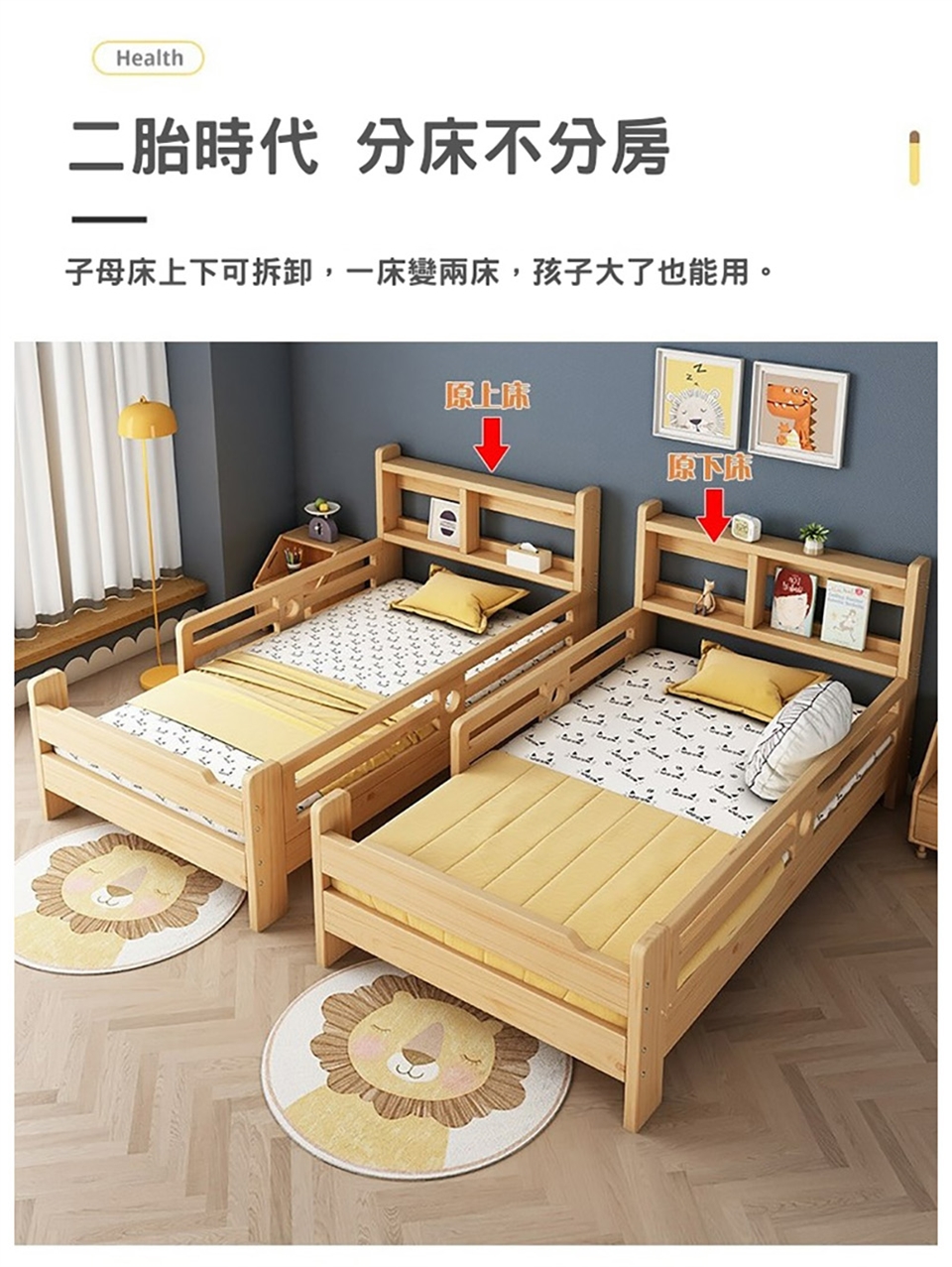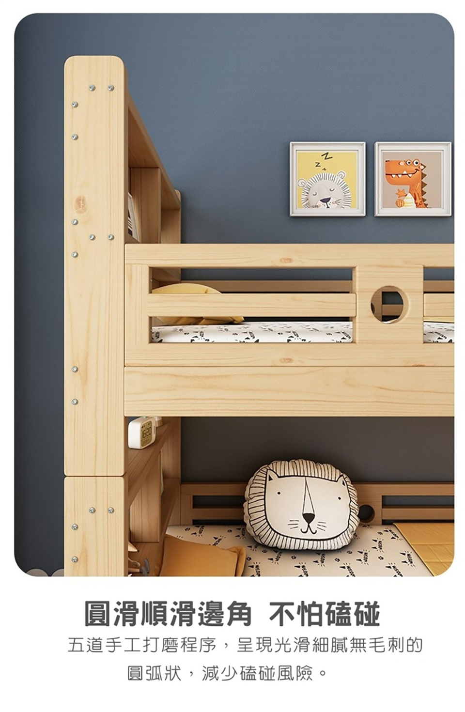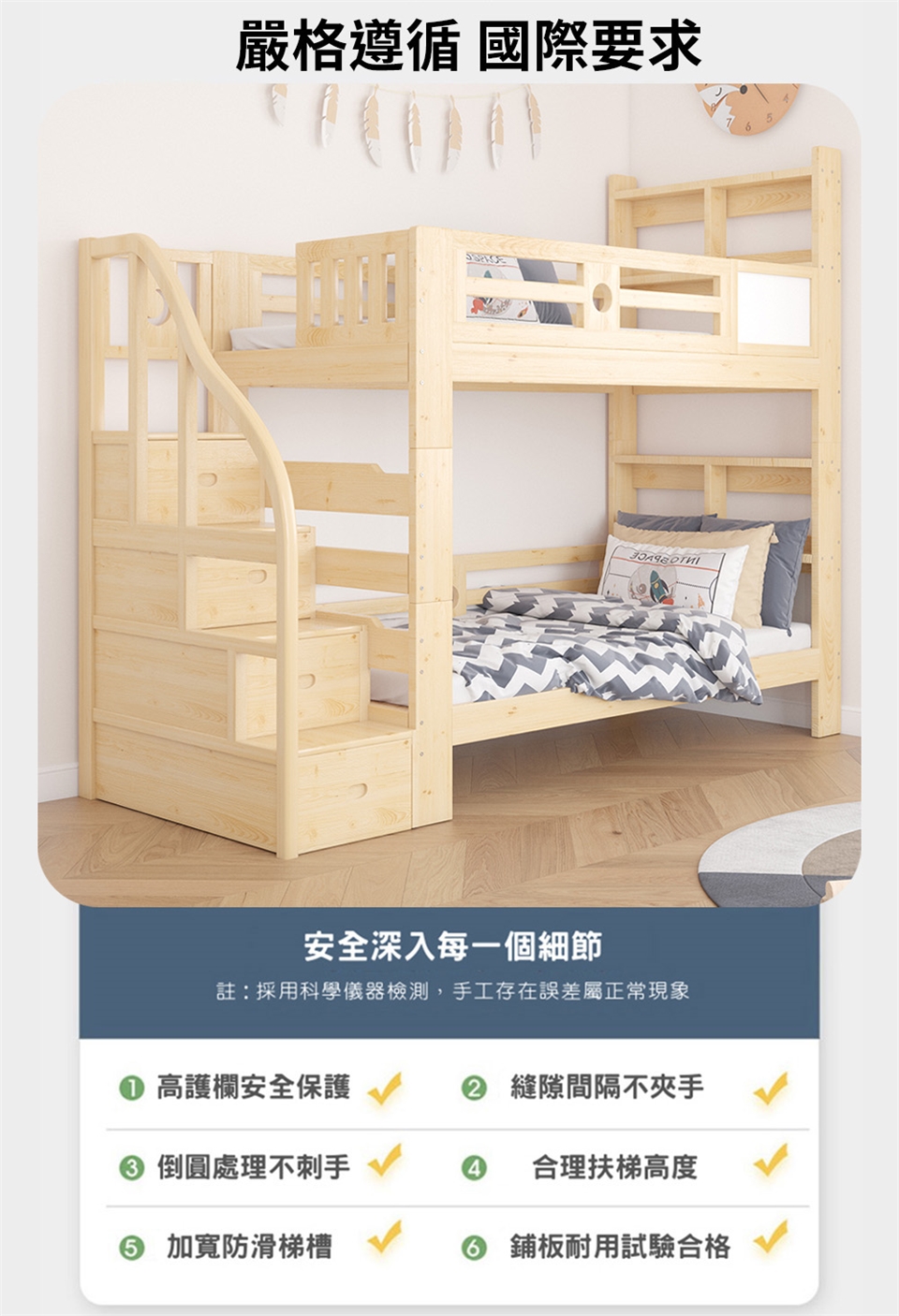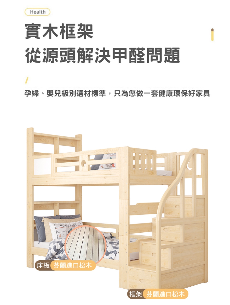安全可靠:採用歐盟最高兒童家具專用木材等級SF級製成,堅固耐用,無毒無害,給孩子一個安全健康的睡眠環境。