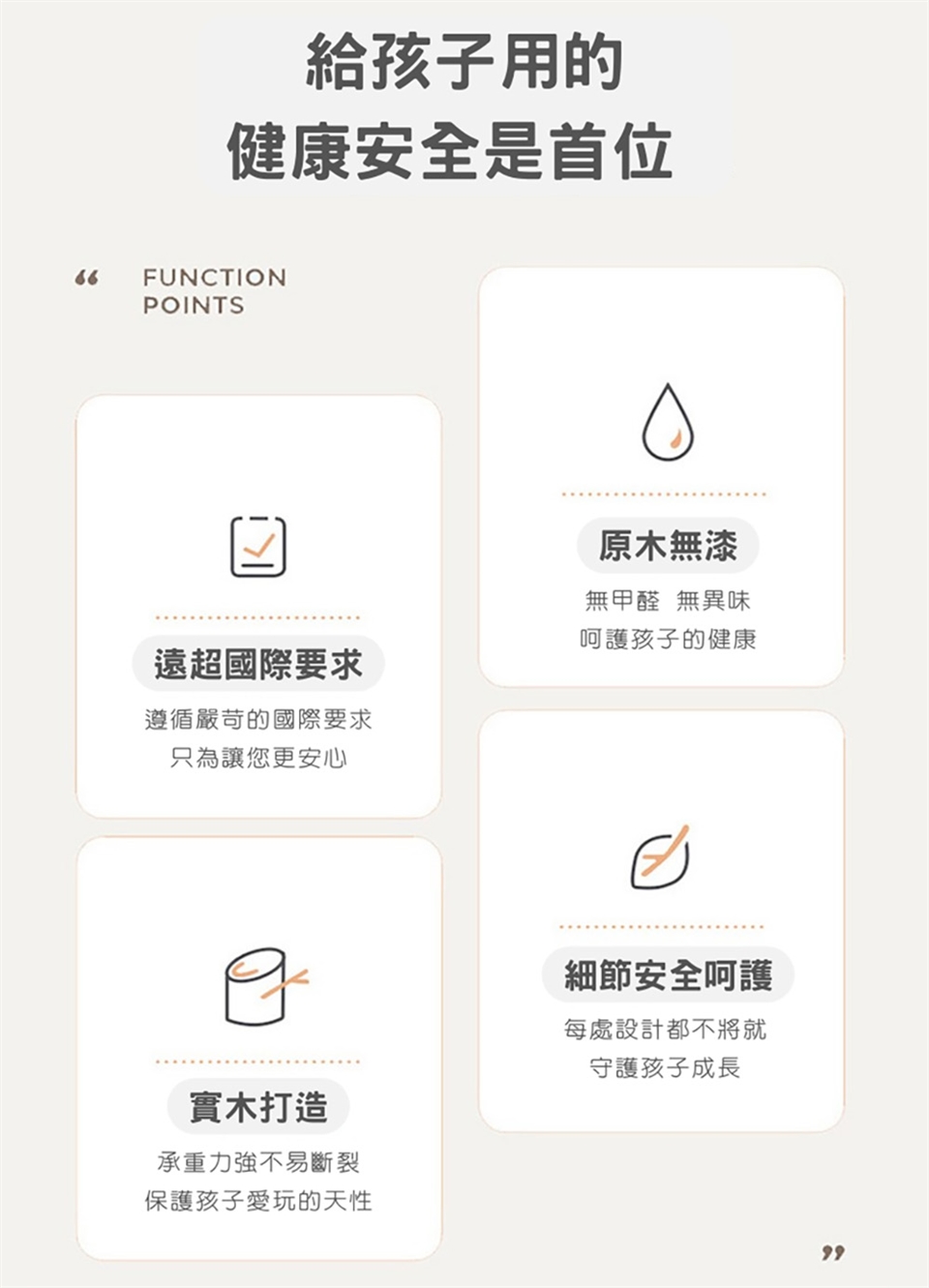 - 台灣品牌:台灣傳統工藝,外銷歐、美、日,我們的每一道工序都經過嚴格檢驗,不管是原材料,還是加工漆面都經SGS檢驗證明無甲醛、零重金屬,為孩子的健康把關。
