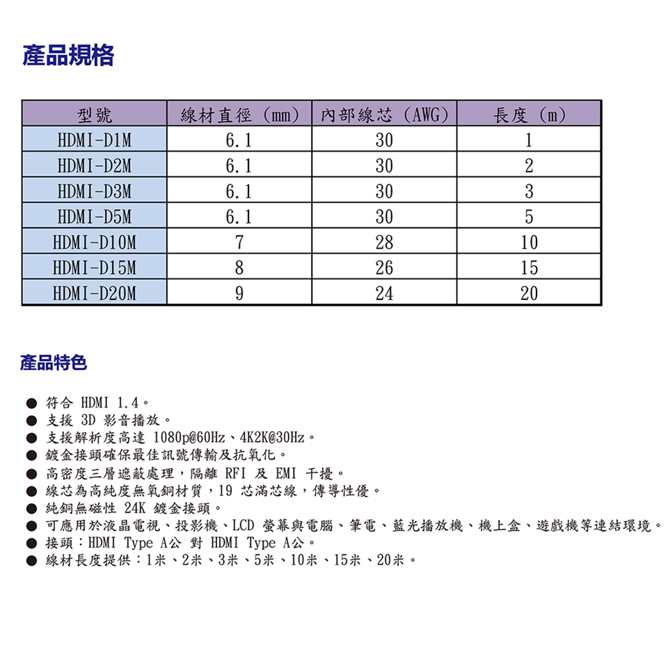 -接頭:HDMI Type A公 對 HDMI Type A公。