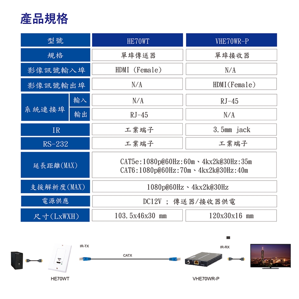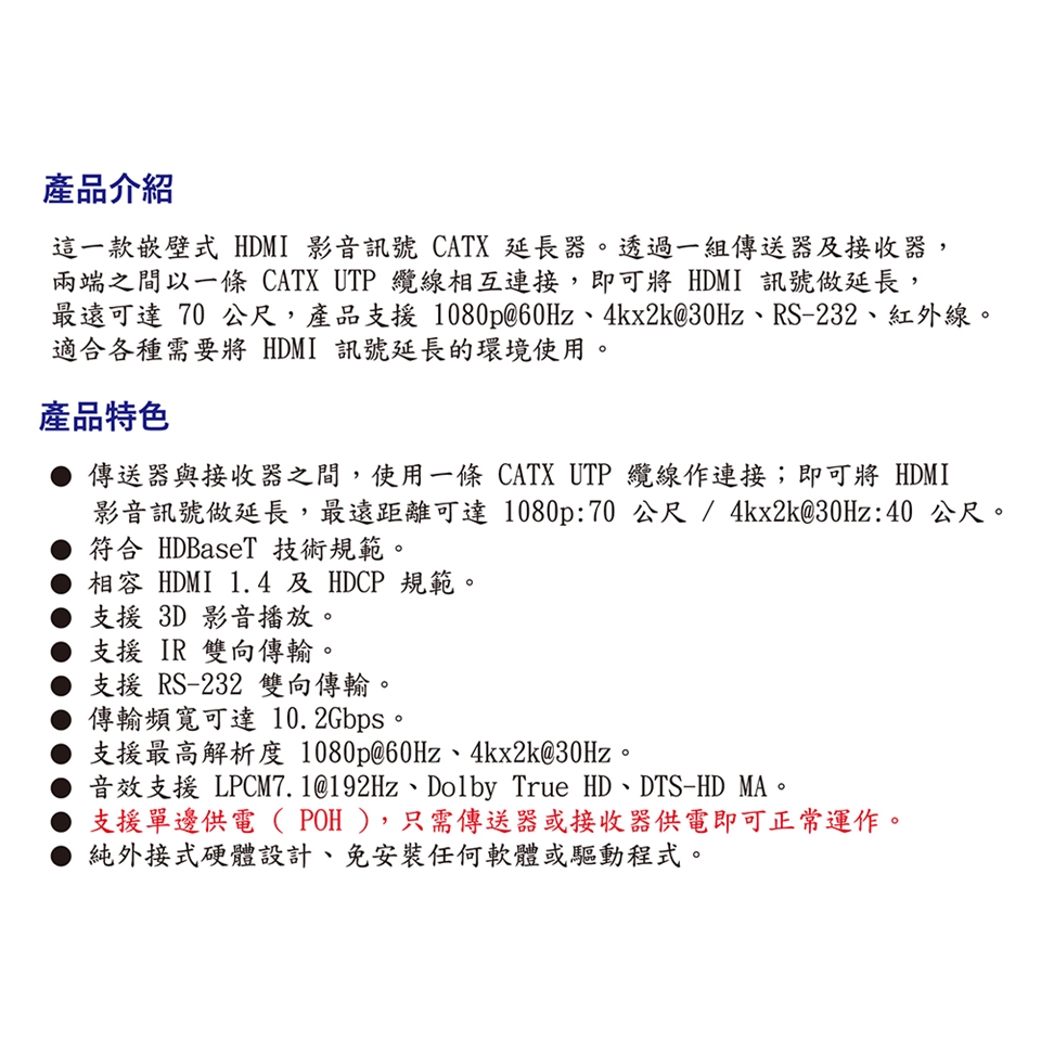 -傳送器與接收器之間,使用一條 CATX UTP 纜線作連接;即可將 HDMI影音訊號做延長,最遠距離可達 1080p:70 公尺 / 4kx2k@30Hz:40 公尺。