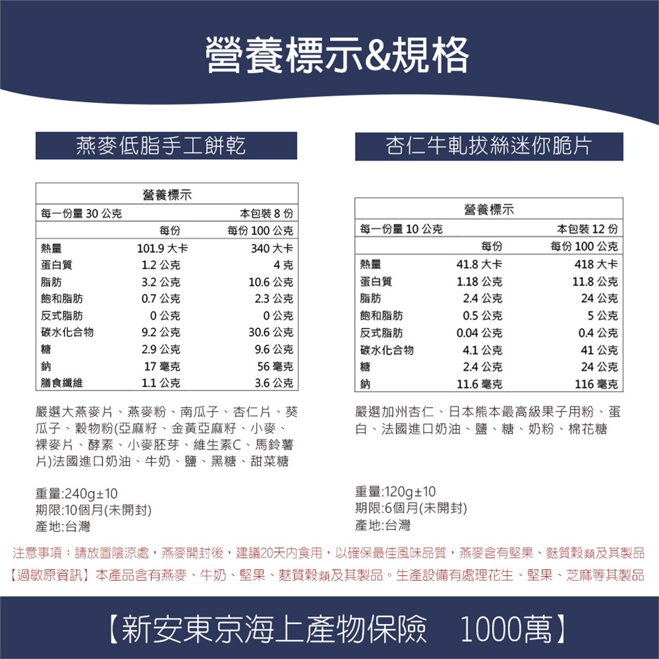 商品詳細介紹 體驗說明 不可體驗 使用方法說明 請放置陰涼處,燕麥開封後,建議20天內食用,以確保最佳風味品質,燕麥含有堅果、麩質穀類及其製品 注意事項 【過敏原資訊】:本產品含有燕麥、牛奶、堅果、麩質穀類及其製品。生產設備有處理花生、堅果、芝麻等其製品