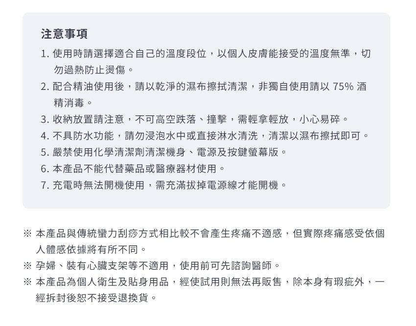 ※ 與傳統蠻力刮痧方式相比較不會產生疼痛不適感,但實際疼痛感受依個人體感依據將有所不同。
