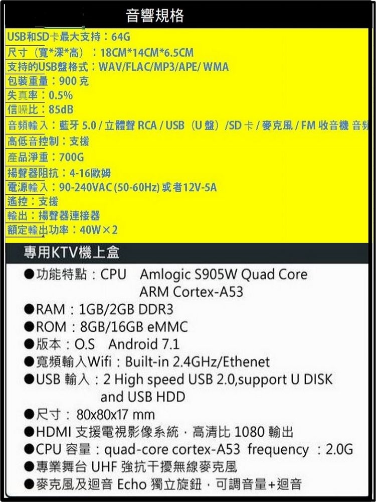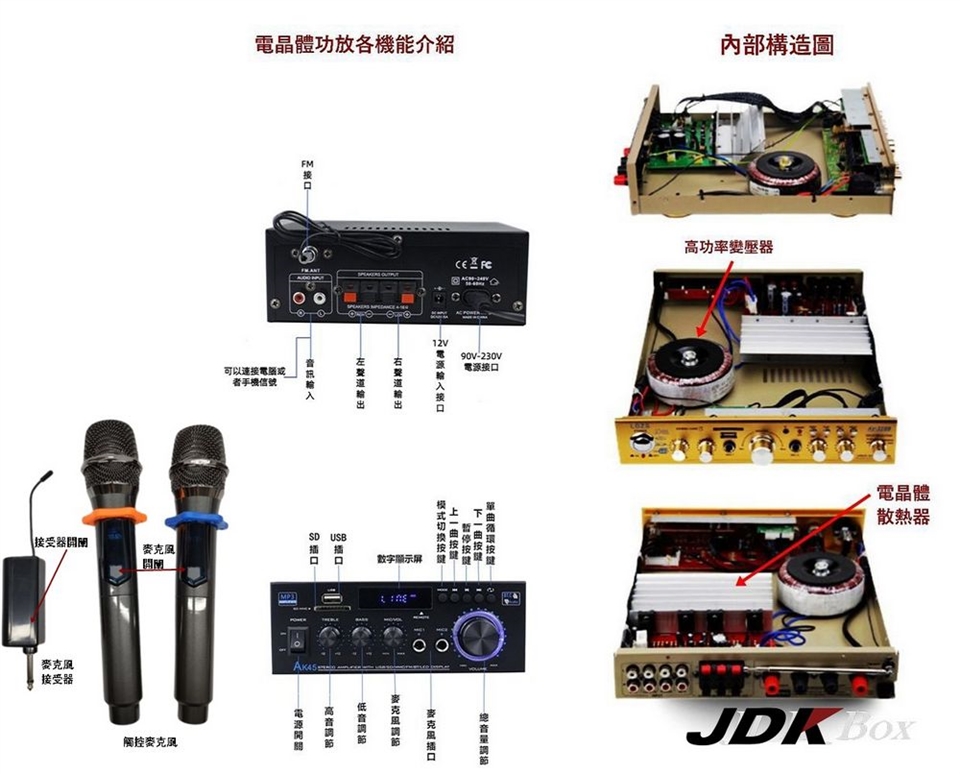 KTV歌聲選擇,高級2聲道擴大機,最高可接4支喇叭音頻2組輸入,,2組輸出麥克風音質可調,高低音,ECHO功能