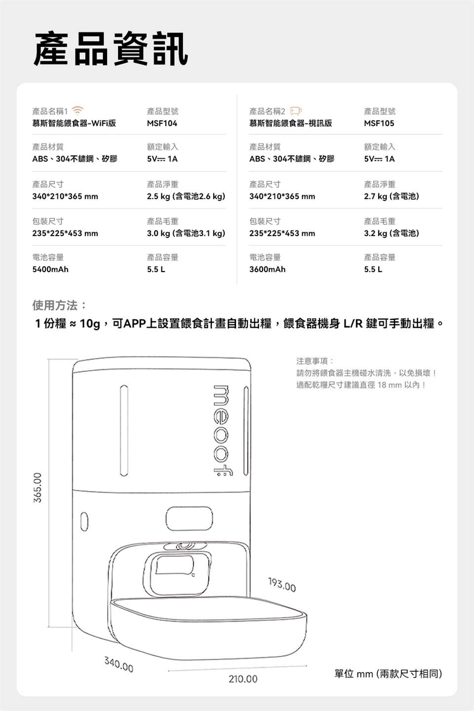 3.出糧格轉一圈代表一份;一份糧約10-15g,每款飼料因大小、重量不同會有些許變動。