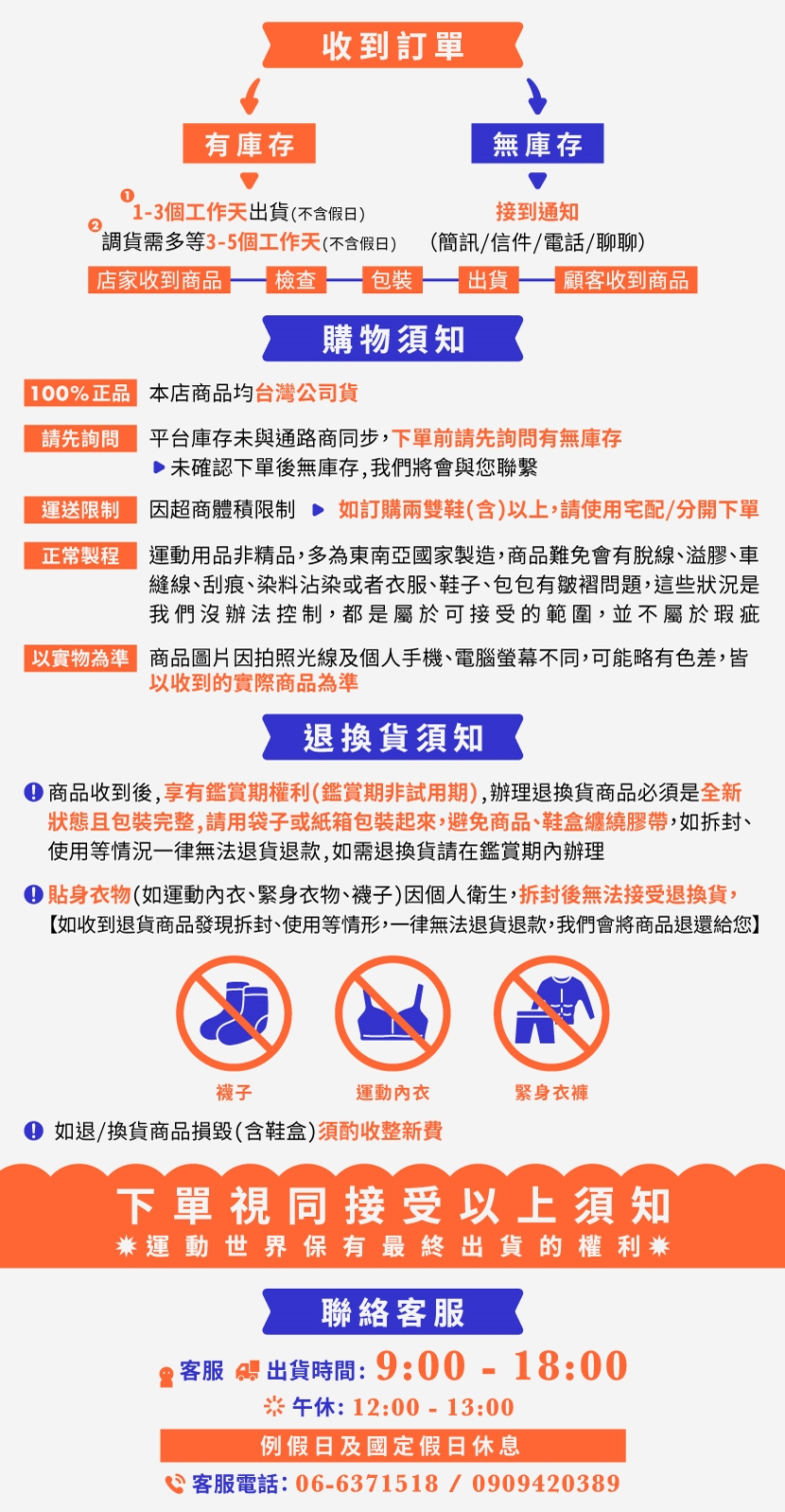 退貨時請注意切勿直接黏貼/書寫文字於商品包裝盒/袋上,並將商品恢復收貨時原包裝,(例如:用一個包裝袋包裝起來)#運動世界 #運動品牌 #台灣正品公司貨如有任何問題歡迎透過客服、Email或者電話詢問,感謝您