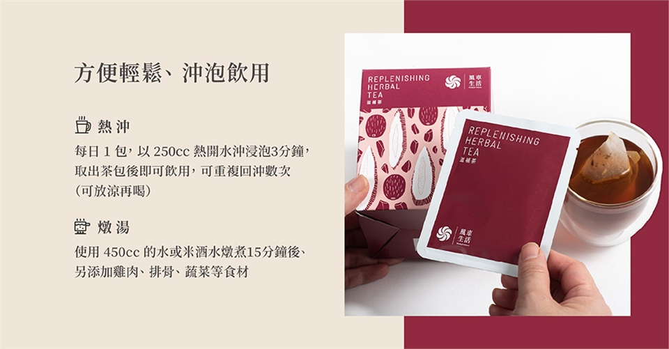 熱沖:每日1包,以250cc熱開水沖浸泡3分鐘,取出茶包後即可飲用,可重複回沖數次