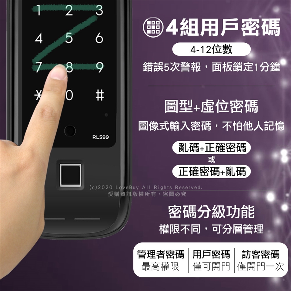 ◆連續5次輸入無效密碼或卡片,即會發出警報並啟動鎖定1分鐘。