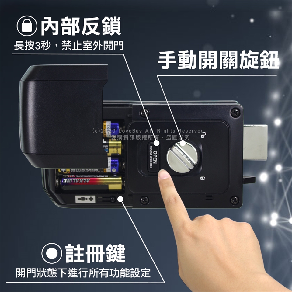 ◆門內長按OPEN鍵3秒即啟動反鎖,從門外無法開門。
