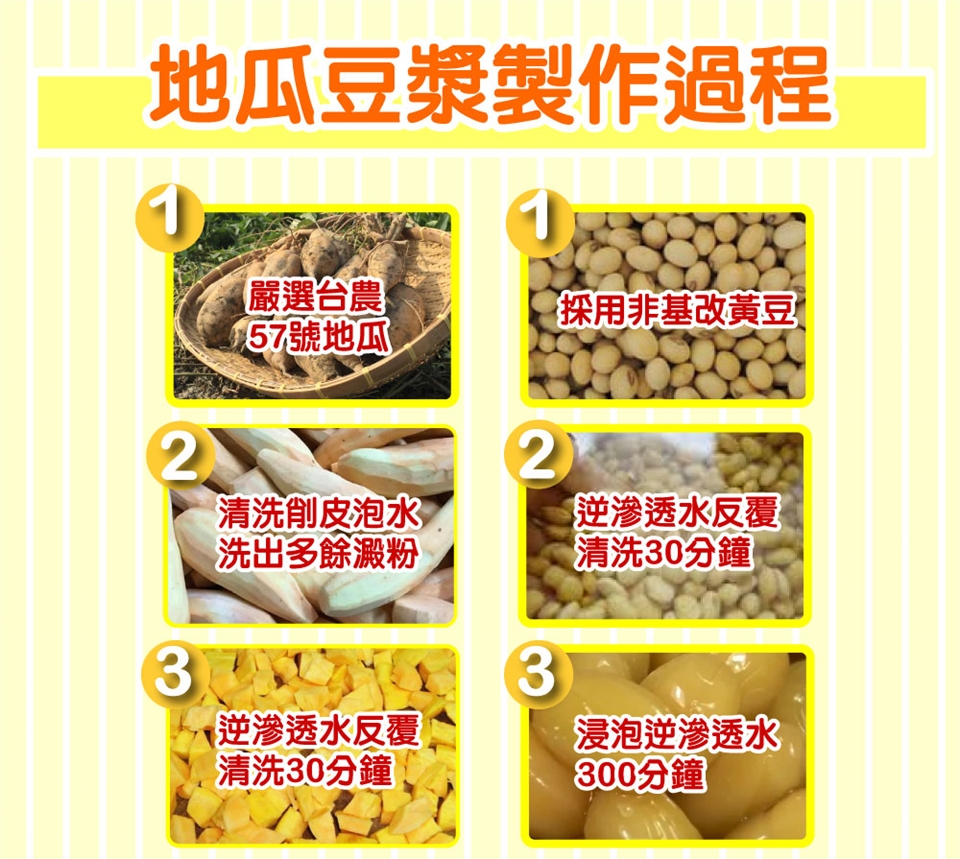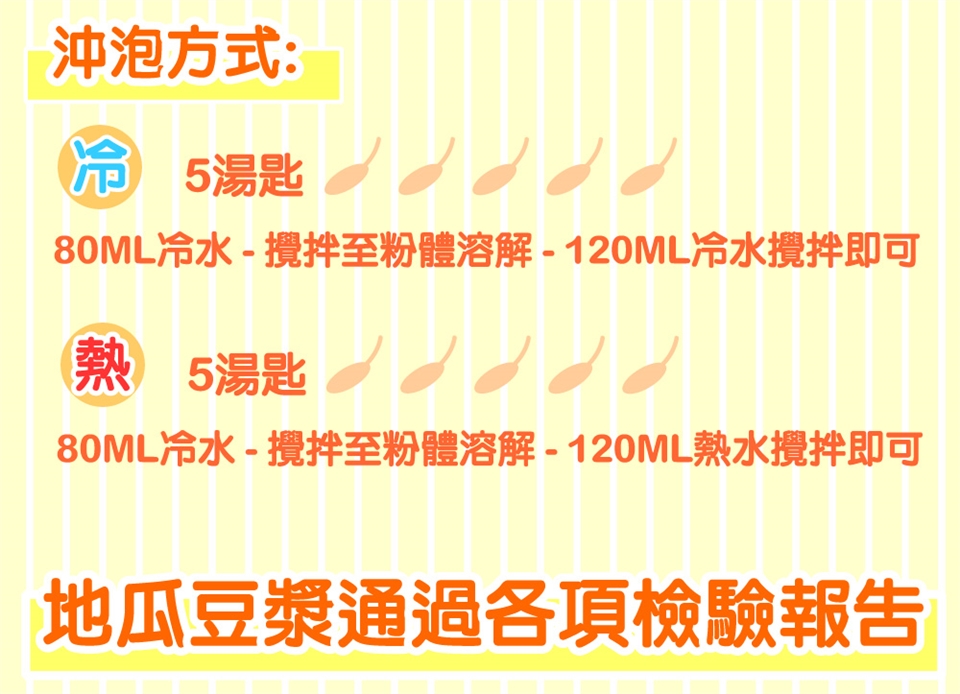 取5湯匙的地瓜豆漿粉,先加入80c.c冷水開水攪拌,讓粉體完全溶解,再加入120c.c熱開水攪拌即可。