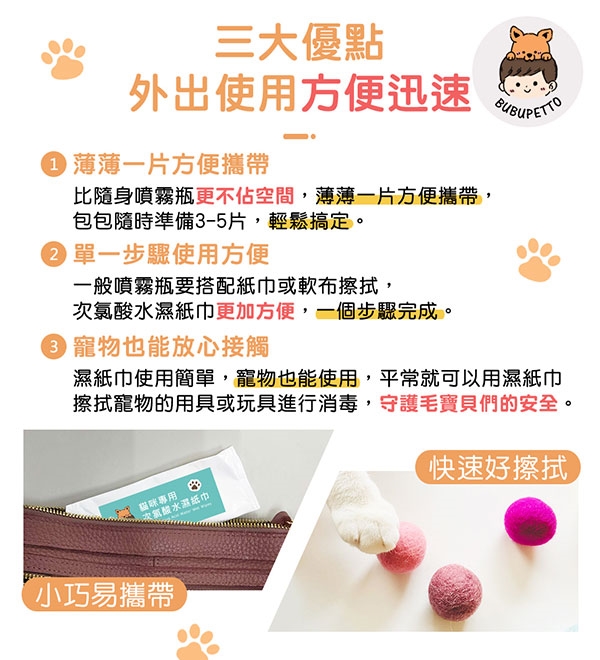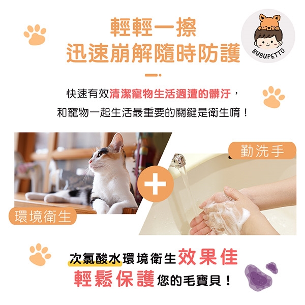 BUBUPETTO-貓咪衣物清潔用次氯酸水濕紙巾-三大優點