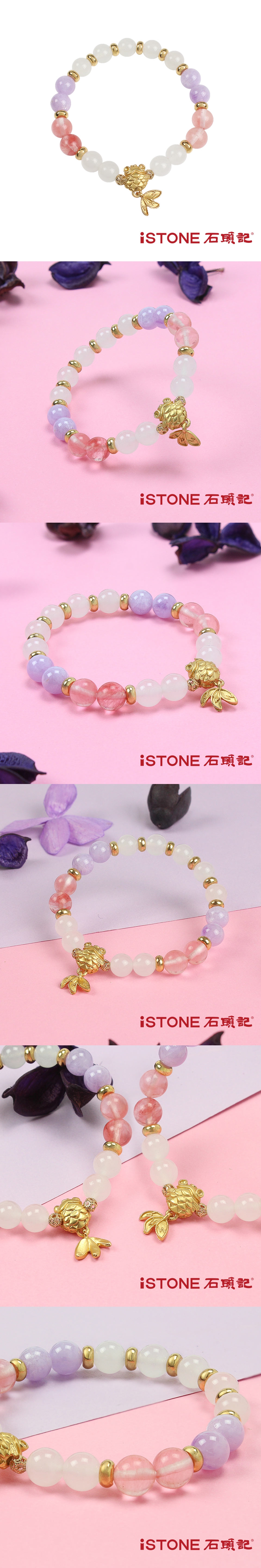 設計師經典手鍊-沉魚落雁,以柔美婉約的草莓晶為和紫玉主體,串上純潔素雅的京白玉,