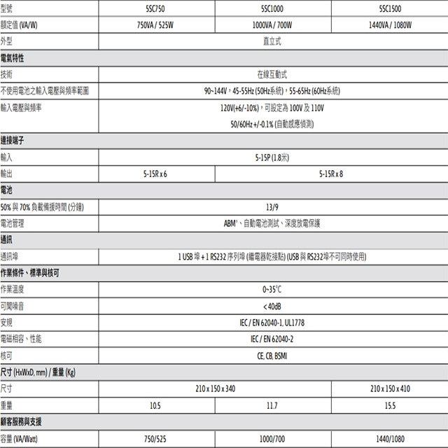 -純淨的正弦波輸出:在電池運作模式下,5SC 能為包含伺服器在內的所有敏感設備提供高品質的工作電源。