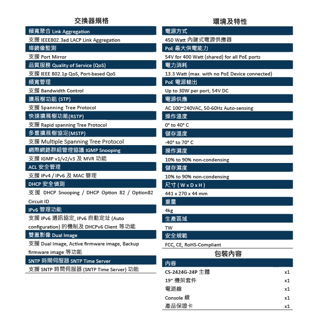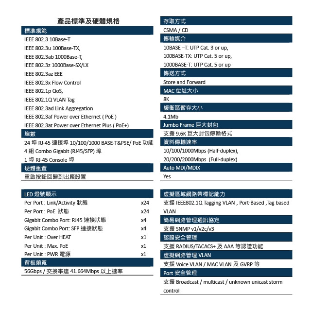 -符合 IEEE 802.3 10Base-T, IEEE 802.3u 100Base-TX, IEEE 802.3ab 1000Base-T, IEEE 802.3z 1000BaseSX/LX IEEE 802.3af PoE, IEEE 802.3at PoE+等規範。