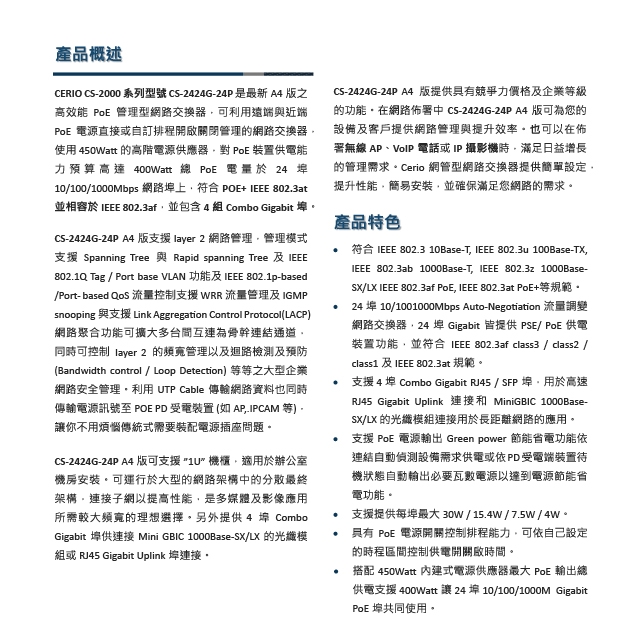 -24 埠 10/1001000Mbps Auto-Negotiation 流量調變網路交換器,24 埠 Gigabit 皆提供 PSE/ PoE 供電裝置功能,並符合IEEE 802.3af class3 / class2 /class1 及 IEEE 802.3at 規範。