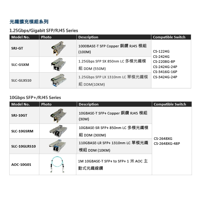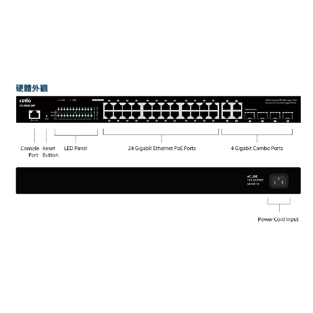 -支援 4 埠 Combo Gigabit RJ45 / SFP 埠,用於高速RJ45 Gigabit Uplink 連接和 MiniGBIC 1000BaseSX/LX 的光纖模組連接用於長距離網路的應用。