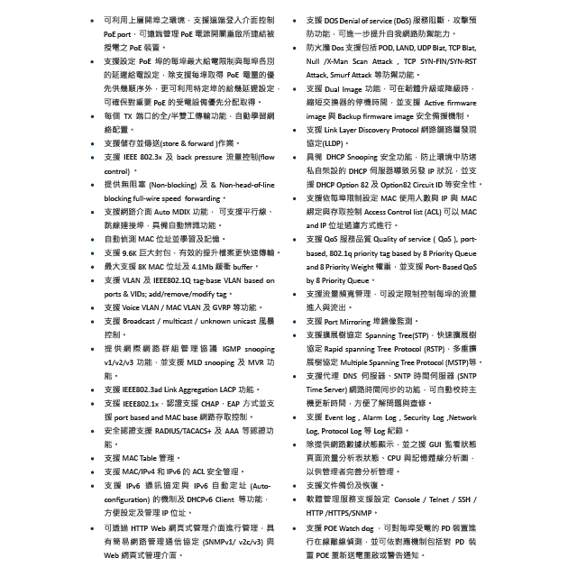 -支援 QoS 服務品質 Quality of service ( QoS ), portbased, 802.1q priority tag based by 8 Priority Queue and 8 Priority Weight 權重,並支援 Port- Based QoS by 8 Priority Queue。
