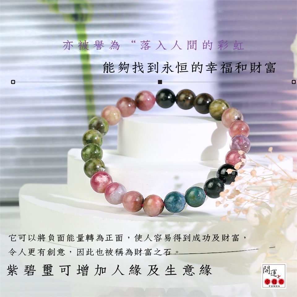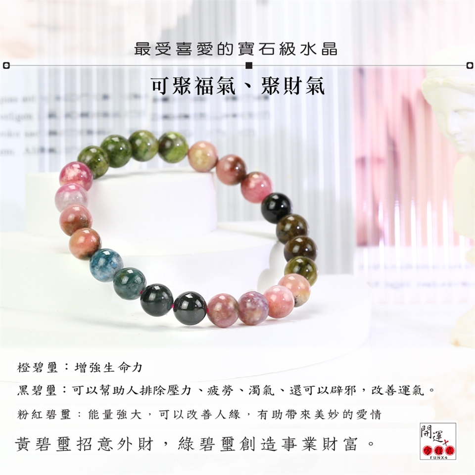 碧璽又稱愿望石,能聚財納富,幫助事業發展。這種晶石的能量很 強,而且可以隨溫度而轉化,有助血液迴圈,氣血虛、身體弱、手腳冰涼者非常適用,對關節方面的疾病也有一定的治療效果。它還 可幫助人補充透支的精力,有助于平緩心境情緒,能幫助愿望實現 ,亦能改善人際關系。碧璽顏色多樣,七色齊全,所以它的能量可 對應身體的每一部份,不同顏色的碧璽有著不同的作用。