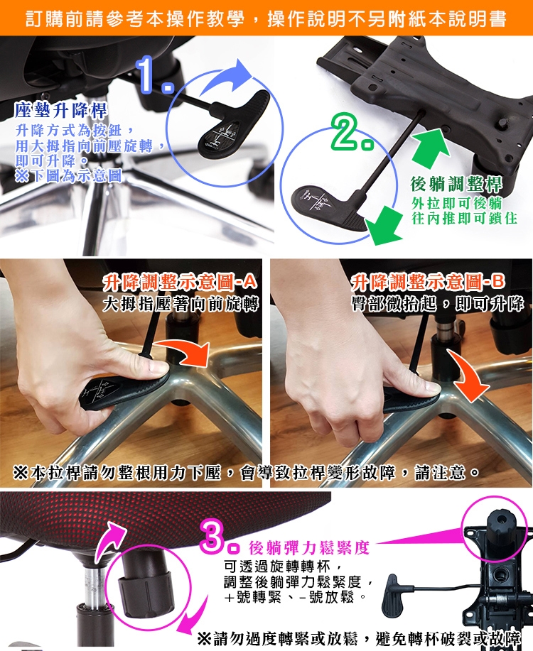 7.使用座椅前,需注意使否有安裝、鎖定穩固,請勿站在椅子上、跳座上椅子、蹬腳、雙腳離地,腳放桌上、盤腿在座椅上,不當使用容易發生危險,或座椅結構損壞。