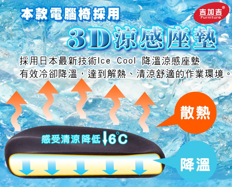 採用日本最新技術Ice Cool 涼感發泡製成的泡棉,有效冷卻降溫,達到解熱、清涼的舒適作業環境,有著泡棉Q軟彈性,以及網布的透氣特性。