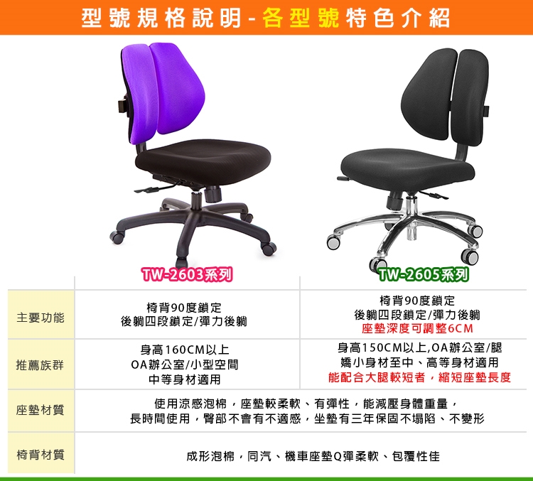 TW-2603低背款雙背椅,適合身高160~185CM使用者,椅背採用人體工學設計,造型看似烏魚子、或是像兩個人體肺的型狀,這樣的設計,是讓我們在乘坐後靠時,能更貼合我們背部,緩和脊椎的重力,降低尾椎壓力,給長時間工作者一張,聰明、會改善坐姿習慣的智慧椅。