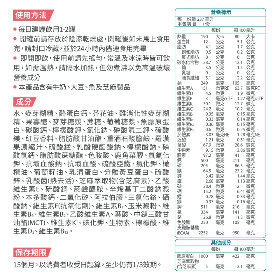 •即開即飲,使用前請搖勻,常溫及冰涼時皆可飲用,如需溫熱,請隔水加熱,但勿煮沸以免高溫破壞營養成分•請依照醫師或營養師指導,視狀況與耐受情形,作為唯一營養來源時,每日建議使用2罐