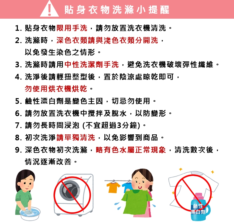 2. 洗滌時請用中性洗潔劑手洗,避免洗衣機破壞彈性纖維。