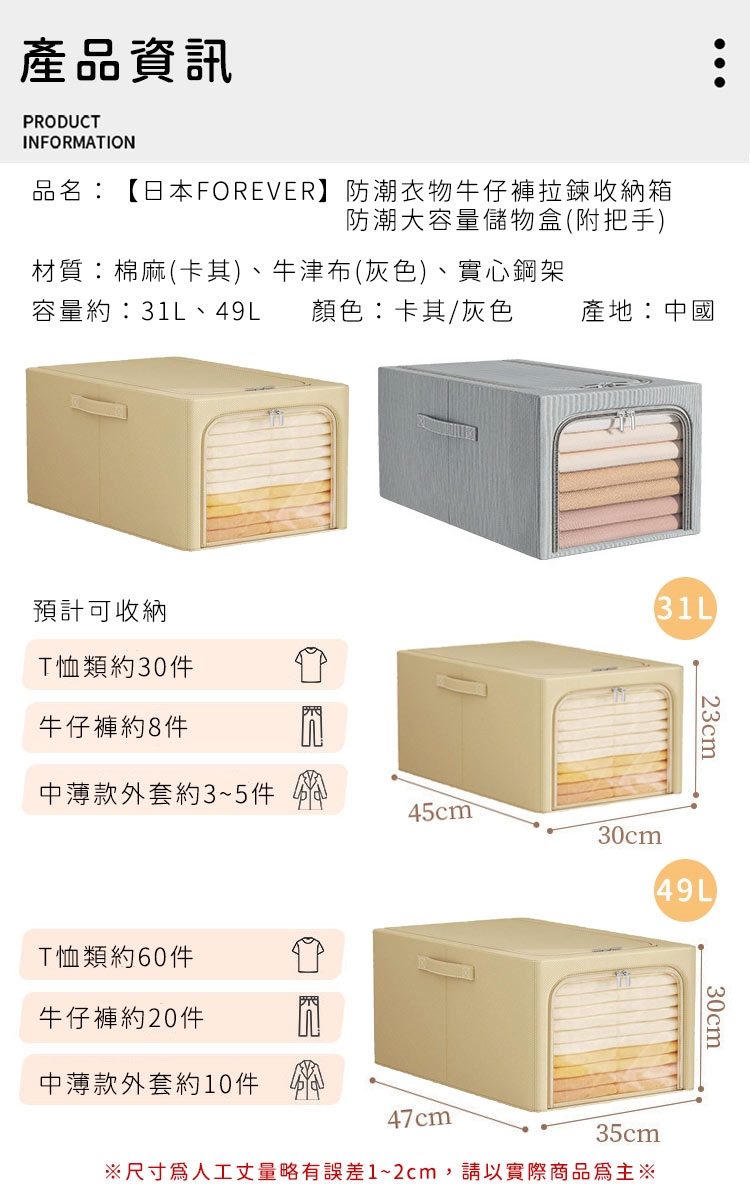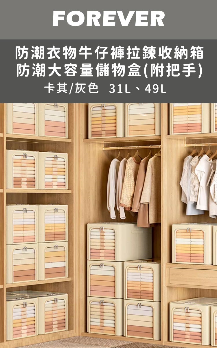 商品名稱:防潮衣物牛仔褲拉鍊收納箱/防潮大容量儲物盒(附把手)49L