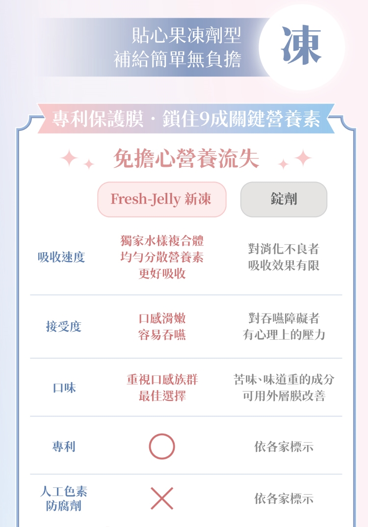 成份:水、蔗糖、綜合莓果濃縮汁(蘋果、蔓越莓、草莓、覆盆莓、櫻桃、黑醋栗、醋栗)、綜合膠體〔刺槐豆膠、鹿角菜膠(鹿角菜膠、葡萄糖)、蒟蒻粉、氯化鉀、玉米糖膠〕、天然香料、微膠囊化鐵(玉米澱粉、焦磷酸鐵、向日葵卵磷脂)、檸檬酸鈉、酵母粉(含維生素 B 群)、檸檬酸、蕎麥粉(含維生素D3)、DL-蘋果酸、羅漢果萃取、海藻鈣、氧化鎂、維生素 E〔乙酸dl-α-生育醇酯(維生素 E)(抗氧化劑)、麥芽糊精、辛烯基丁二酸鈉澱粉、二氧化矽〕、葡萄糖酸鋅、塔拉膠、結蘭膠、(6S)-5-甲基四氫葉酸葡萄糖胺鹽。