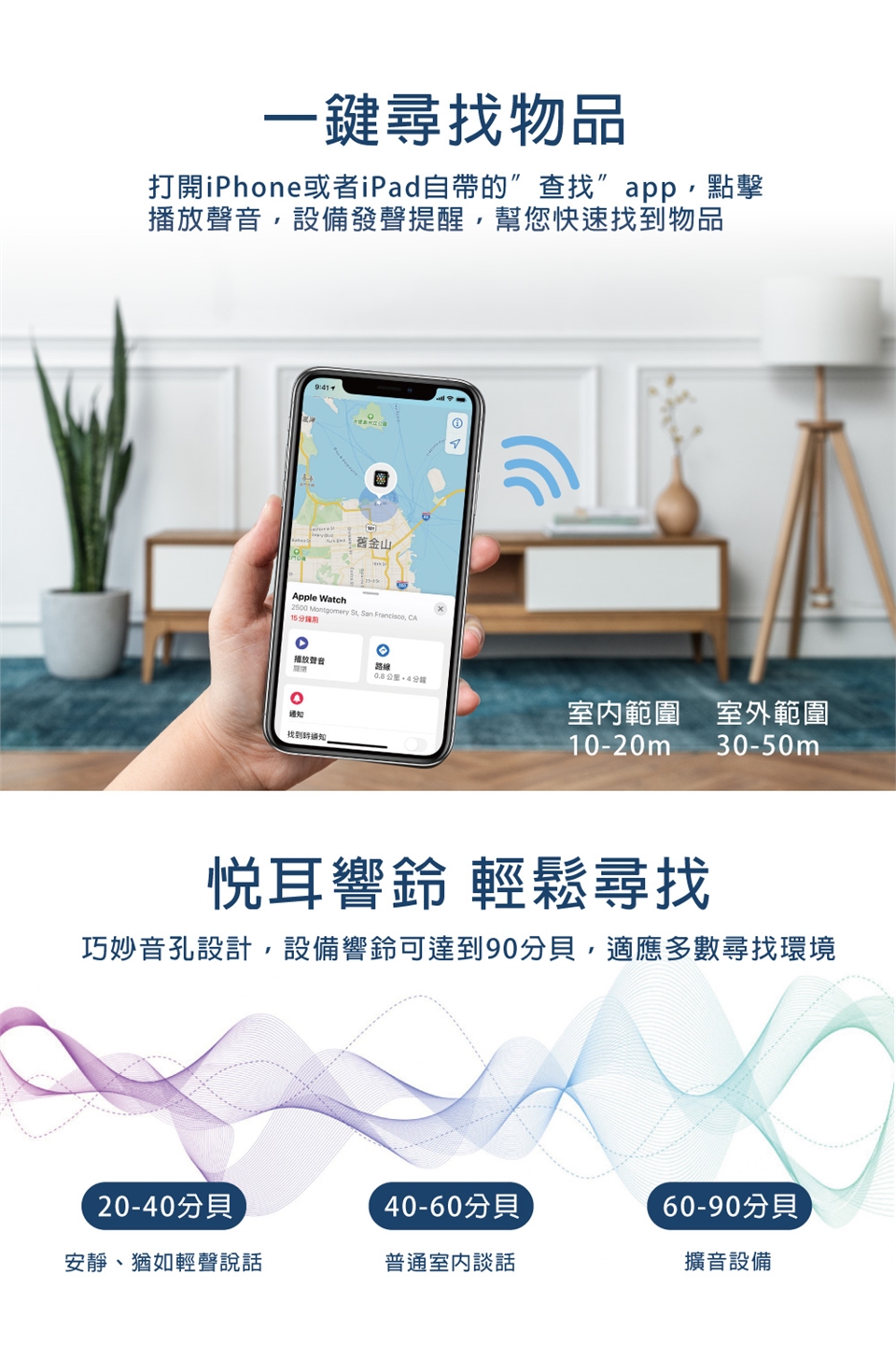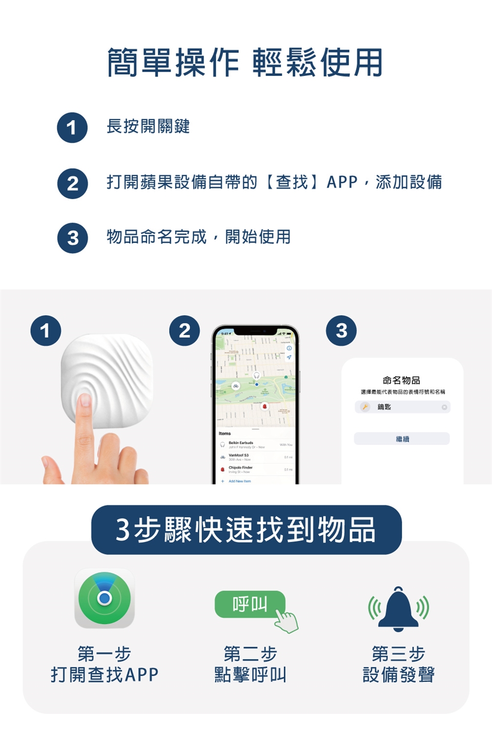 配對方法請使用蘋果內建app尋找,點按下方物品欄,右上角有一個+然後點按新增「其他物品」同時手機開始偵測後把追蹤器靠近按下按鈕兩下即可被搜尋配對
