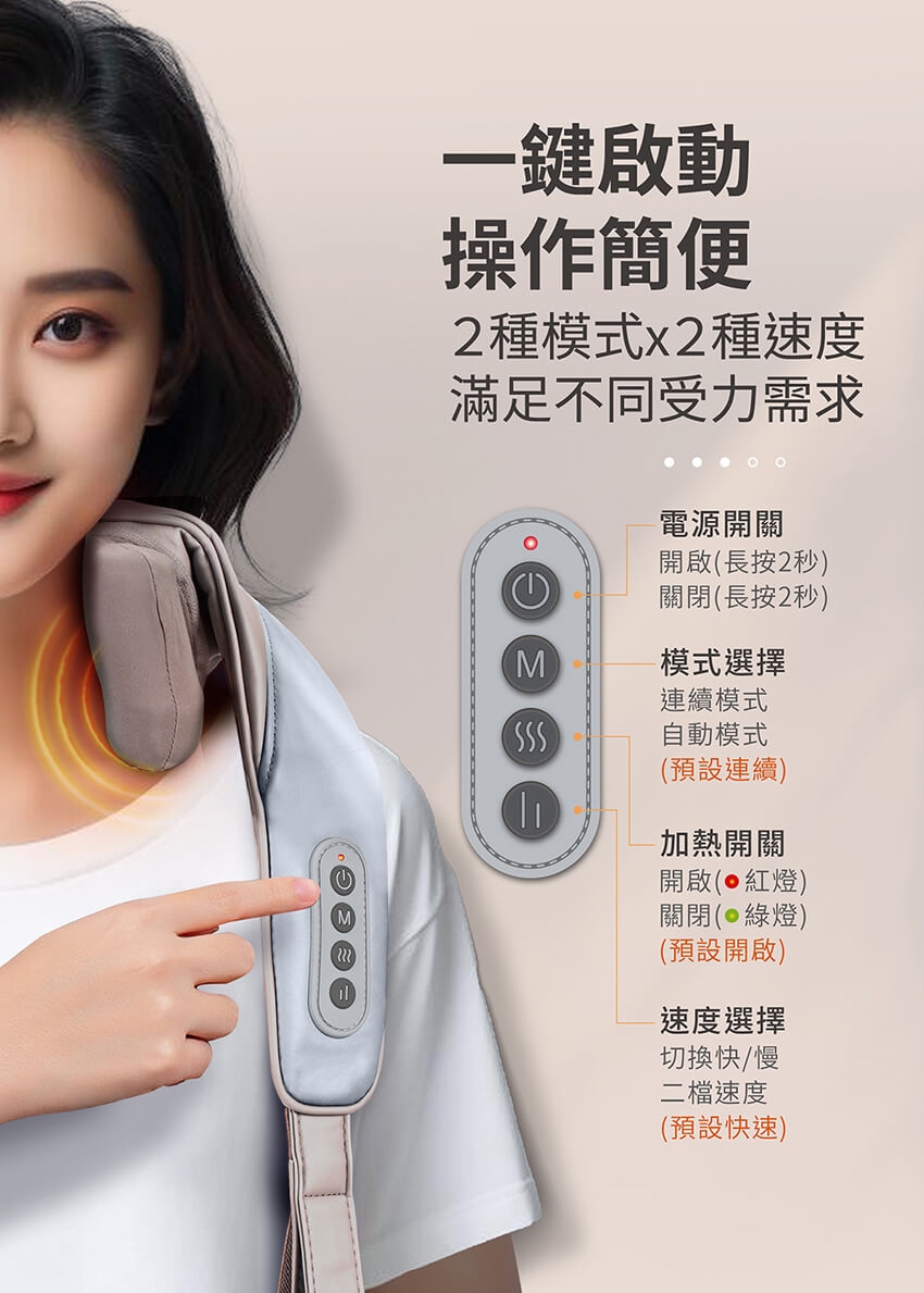 6. 按摩器有加熱功能,熱感覺遲緩者,使用時需有人員在旁協助,密切注意。