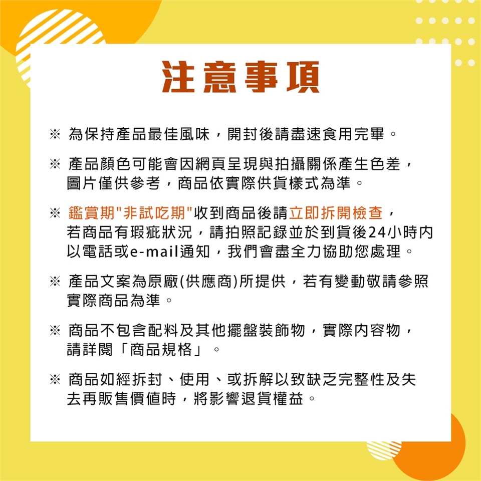 ※ 鑑賞期"非試吃期"收到商品後請立即拆開檢查,若商品有瑕疵狀況,請拍照記錄,並於到貨後24小時內以電話或e-mail通知,我們會盡全力協助您處理。