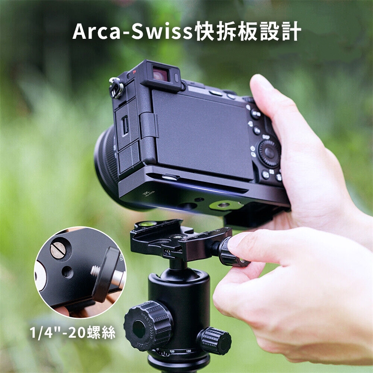 ●1/4"-20母螺孔和阿卡Arca-Swiss快拆板底座設計,讓您可將帶有此款手柄的相機能快速地裝至三腳架上使用。
