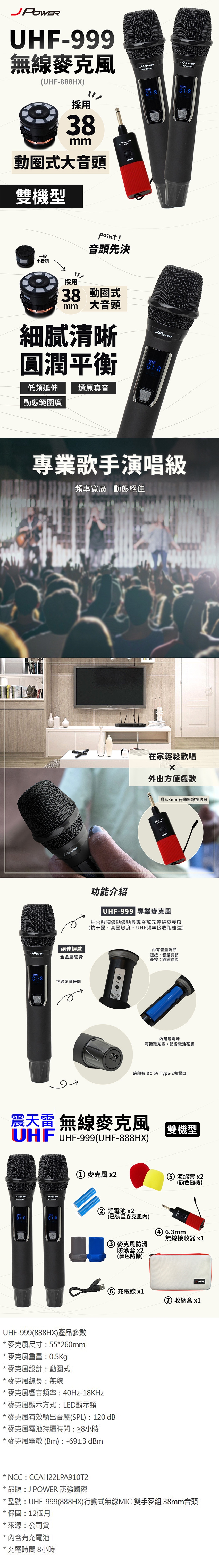 JPOWER 震天雷UHF-999(888HX)行動式無線麥克風組- 雙機型