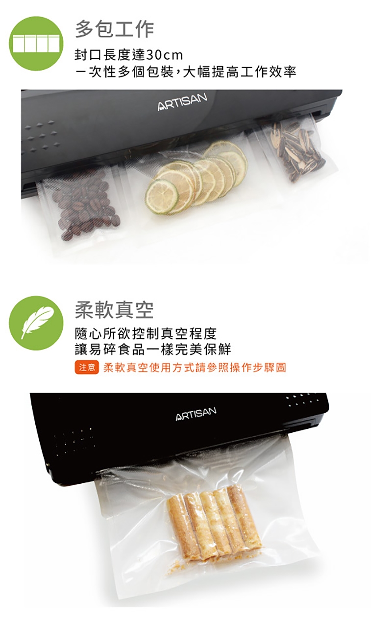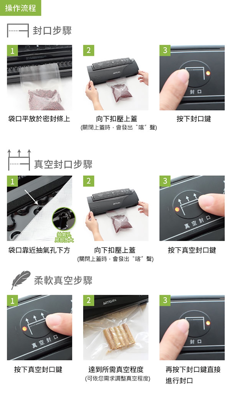 ※ 需使用「有紋路」的真空包裝袋材,才能抽真空