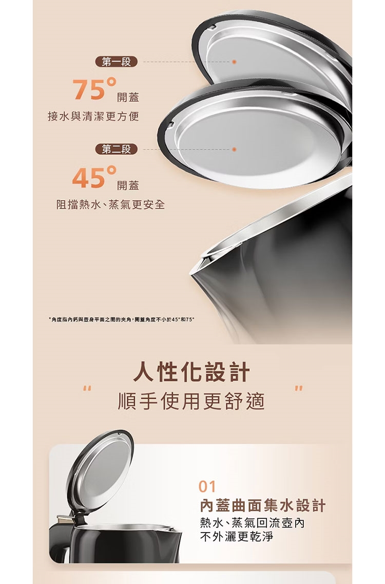 ◆ 壺蓋曲面回流設計 積水回流不飛濺