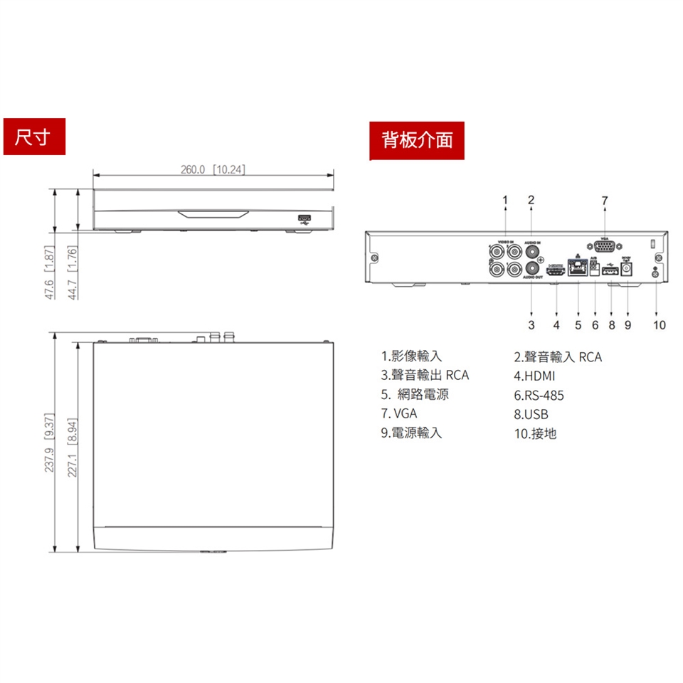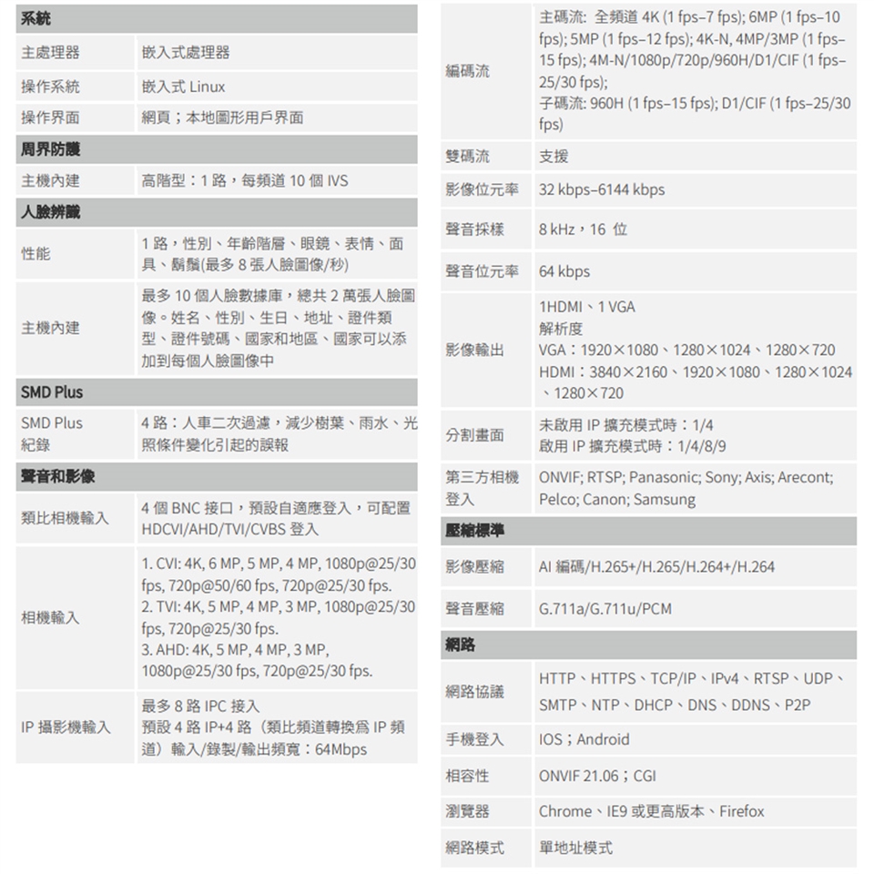 -支援:8MP,IPC 8MP,錄影解析度:4K、6M、5M、4M、1080P、1080N、720P等