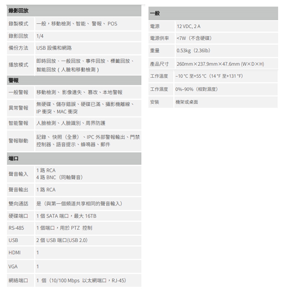 -H265,4路(單顆最大支援16TB),IP:4+4,警報:N/A