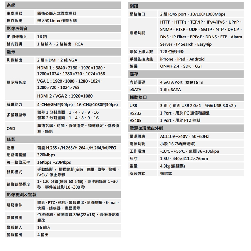 -16路 "1.5U" 4硬碟 (支援16TB),警報:16輸入4輸出。備援:N+M集群