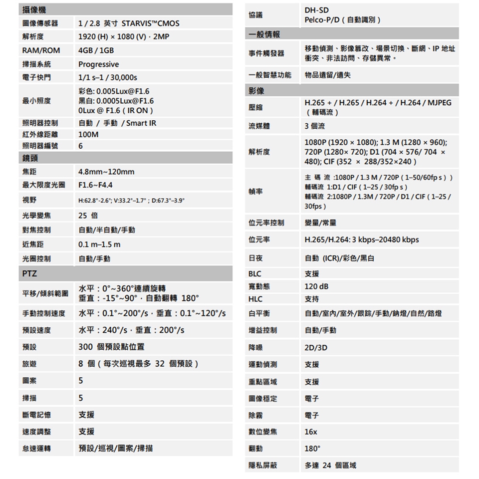 -25倍,1080P,1/2.8”CMOS,3個碼流。照度:0.005Lux@F1.6彩色
