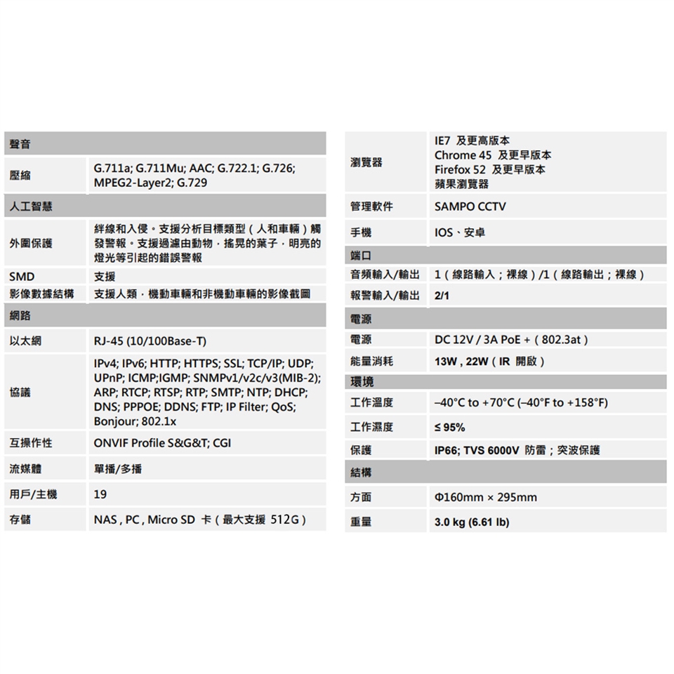 -聲音:1輸入1輸出 裸線,警報:2輸入1輸出。Micro SD儲存 (最大 512GB)