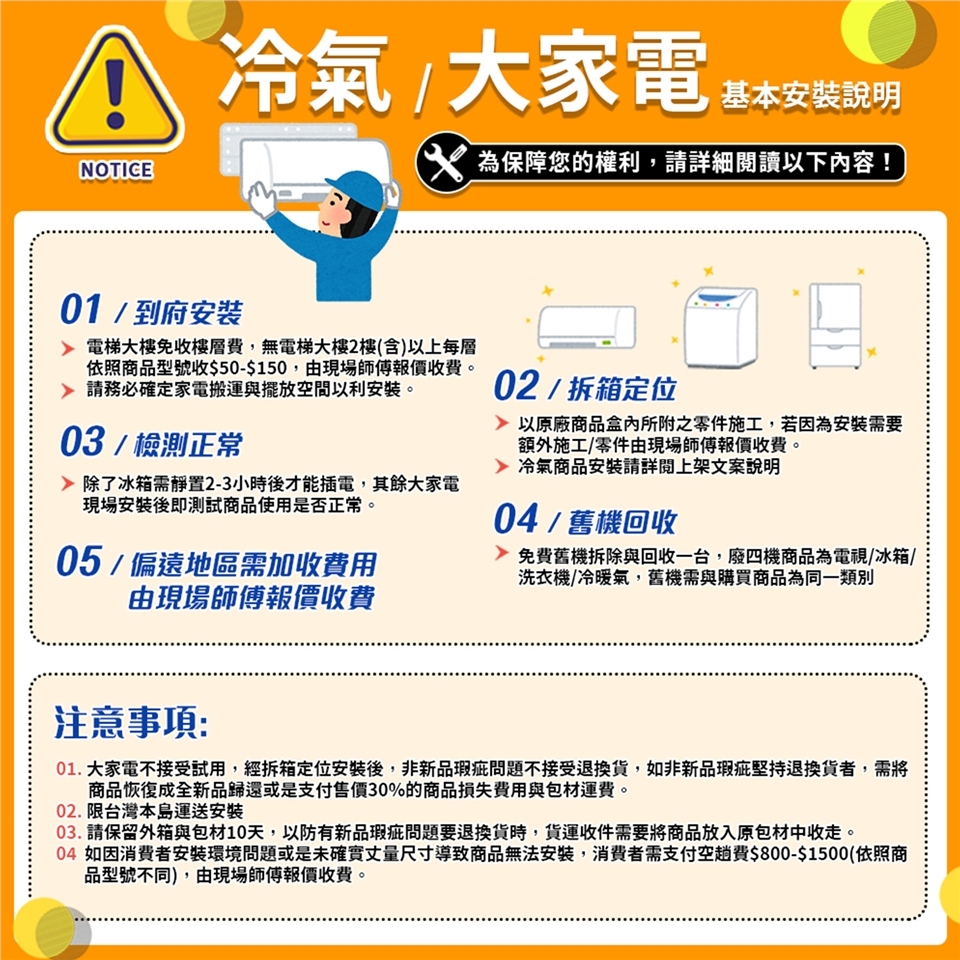◆大型家電需電聯預約配送,安裝時間約需要7-21工作天(以師傅實際排單日期為準),如遇旺季原廠缺貨或是偏遠地區則需更久,敬請見諒!