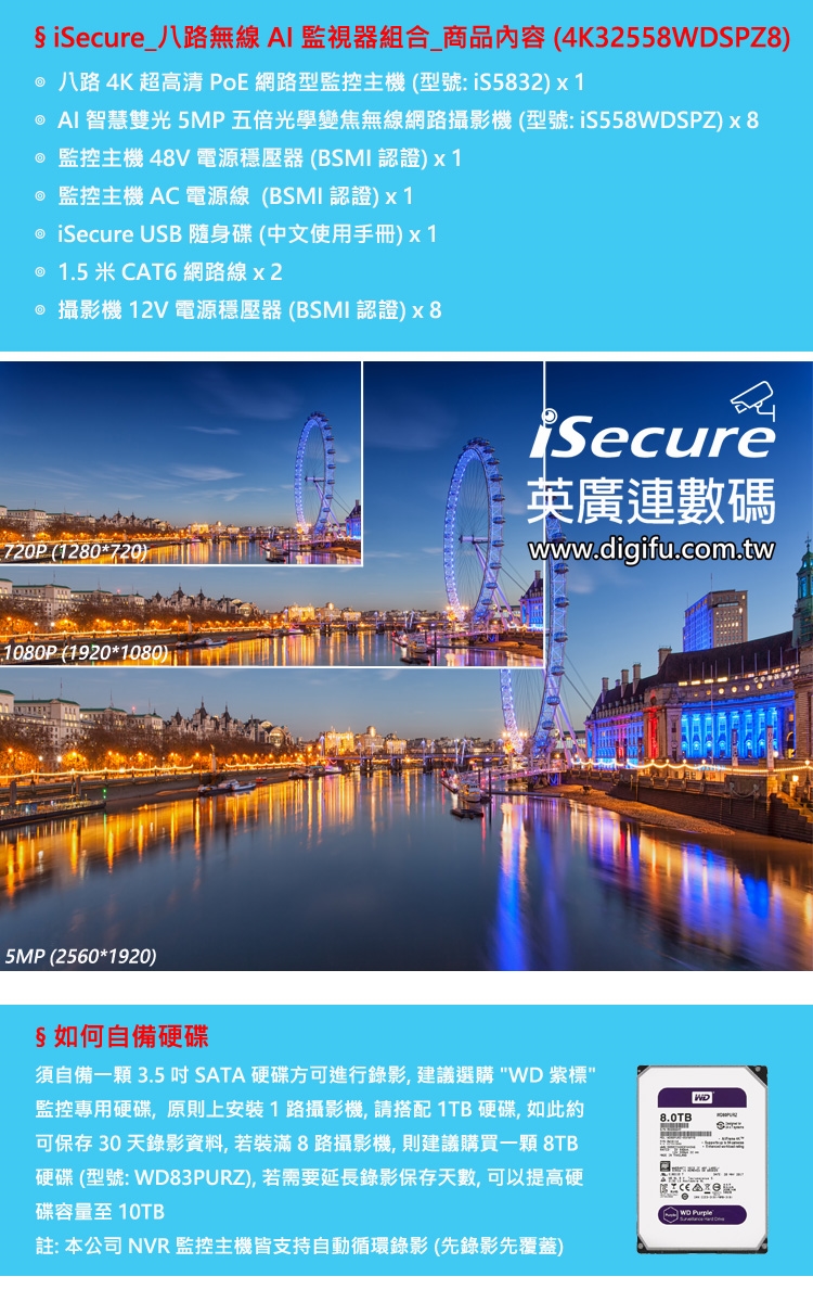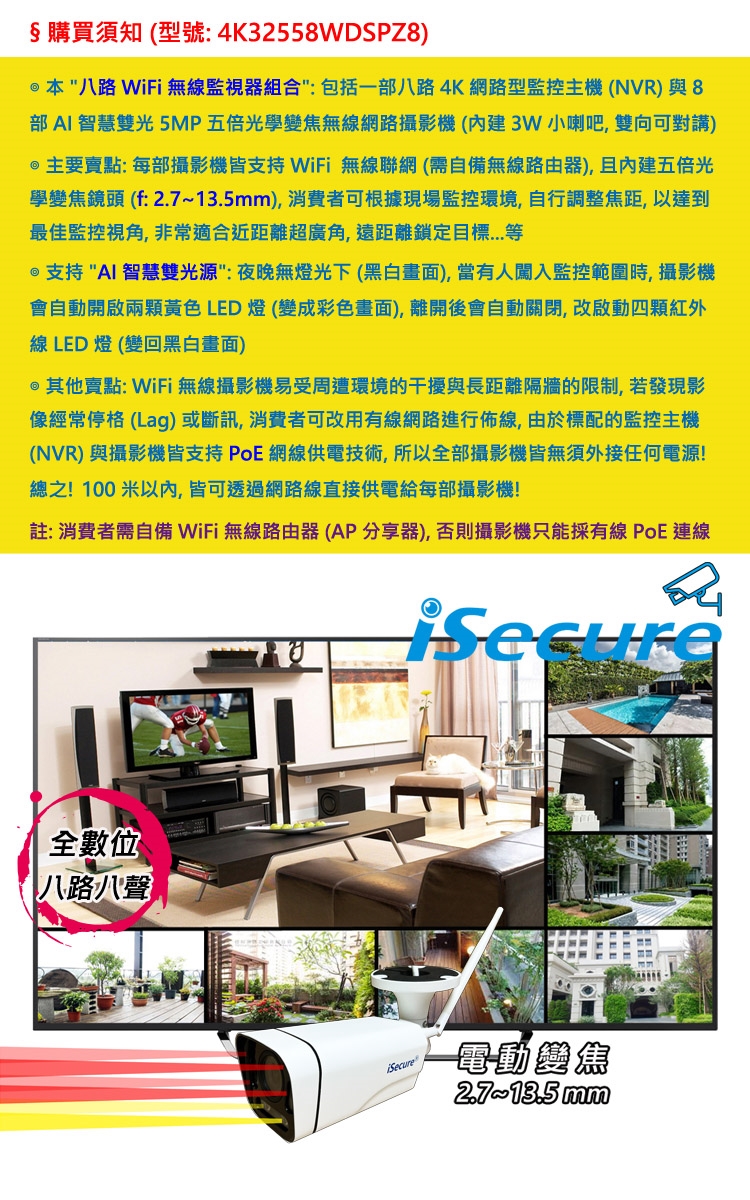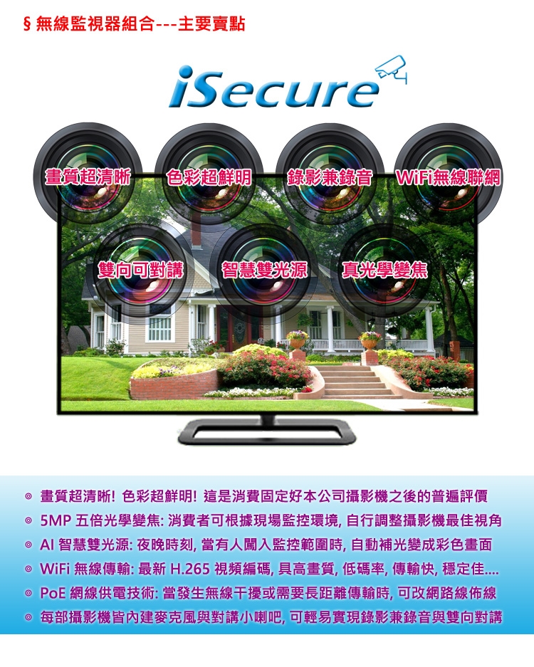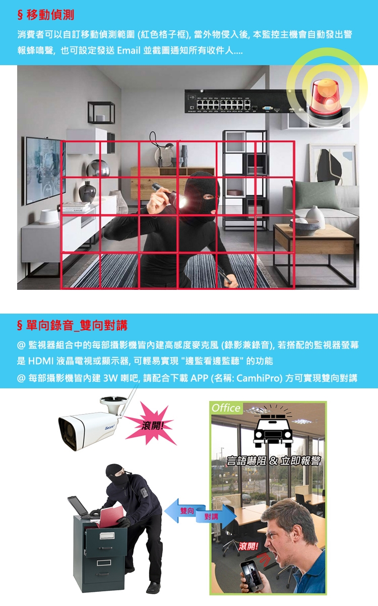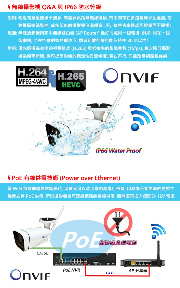 2. 本監視器組合中的監控主機支持最新網線供電技術 (PoE), 因此所有與監控主機相連的 PoE 攝影機皆可免外接電源, 改透過網路線直接供電!