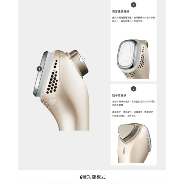 雙重感應頭 - 1.高滲透感應頭:提升皮膚角質層滲透,幫助保養品中的高分子美容成分,有效滲透肌底 2.離子感應頭:清潔肌膚、導出藏匿於毛孔中的污垢和老廢角質;將美容成分導入至肌膚角質層