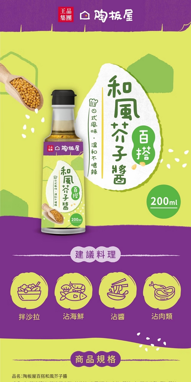 ★ 和風芥子醬:甘醇和風醬佐以芥子顆粒,風味辛香微嗆,是輕食搭配的首選,展現多層次味蕾,清爽不油膩!
