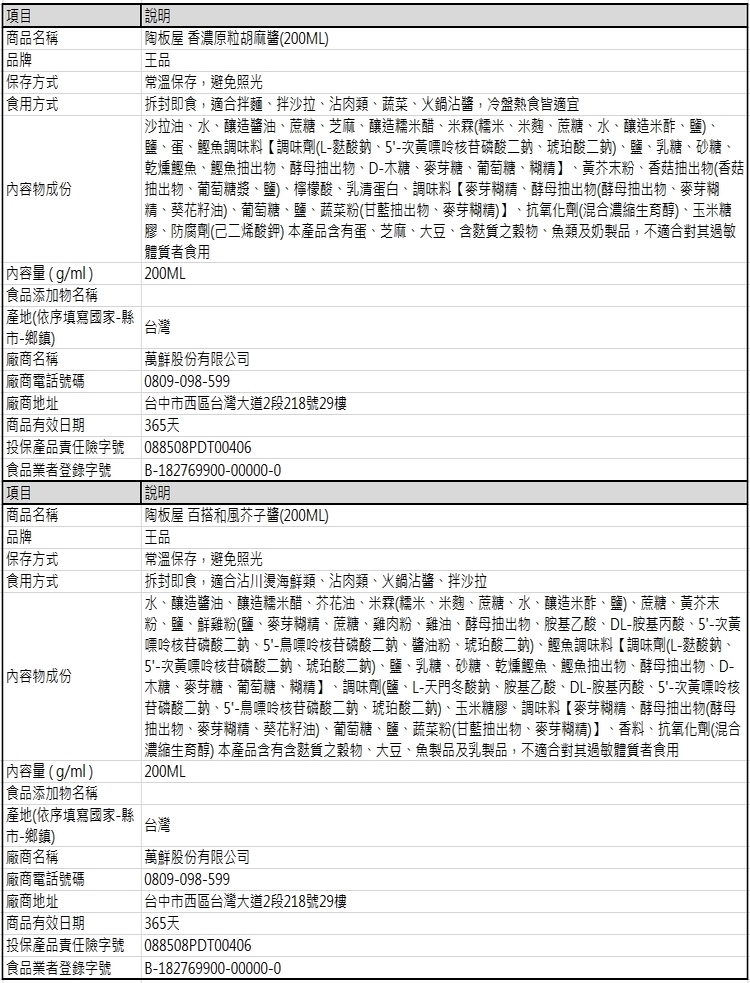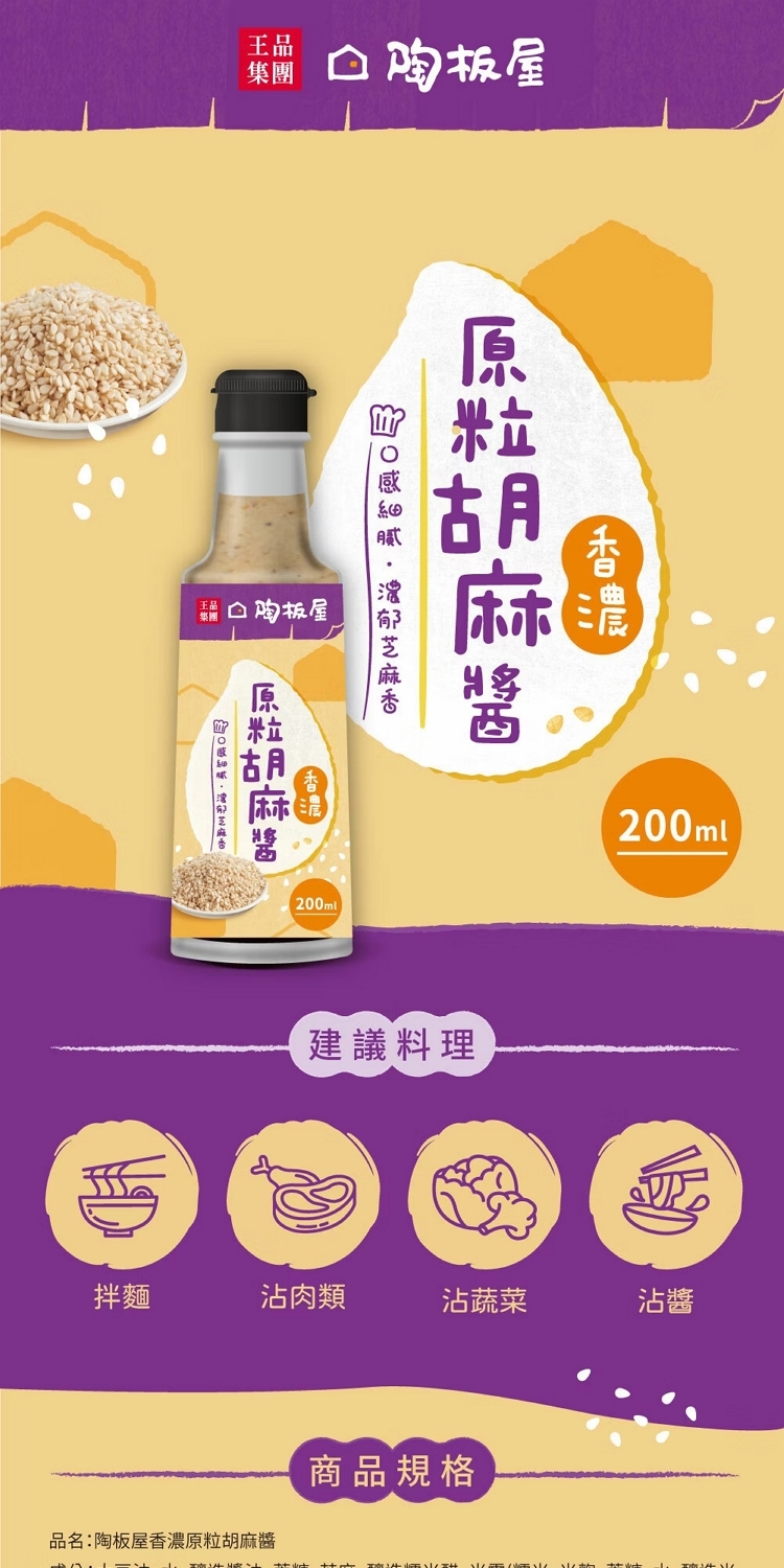 ★ 香濃原粒胡麻醬:使用研磨後的焙煎芝麻,撲鼻芝麻香氣,濃郁口感,佐餐拌麵、蔬果沾淋,冷盤熱食皆適用