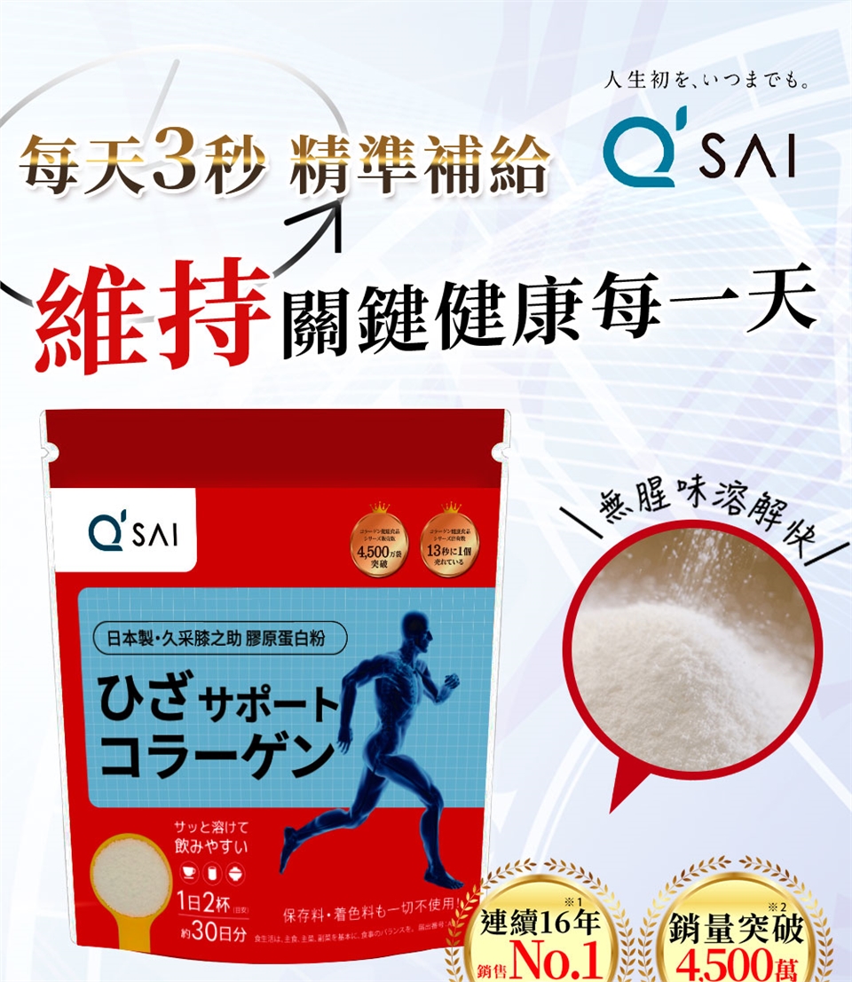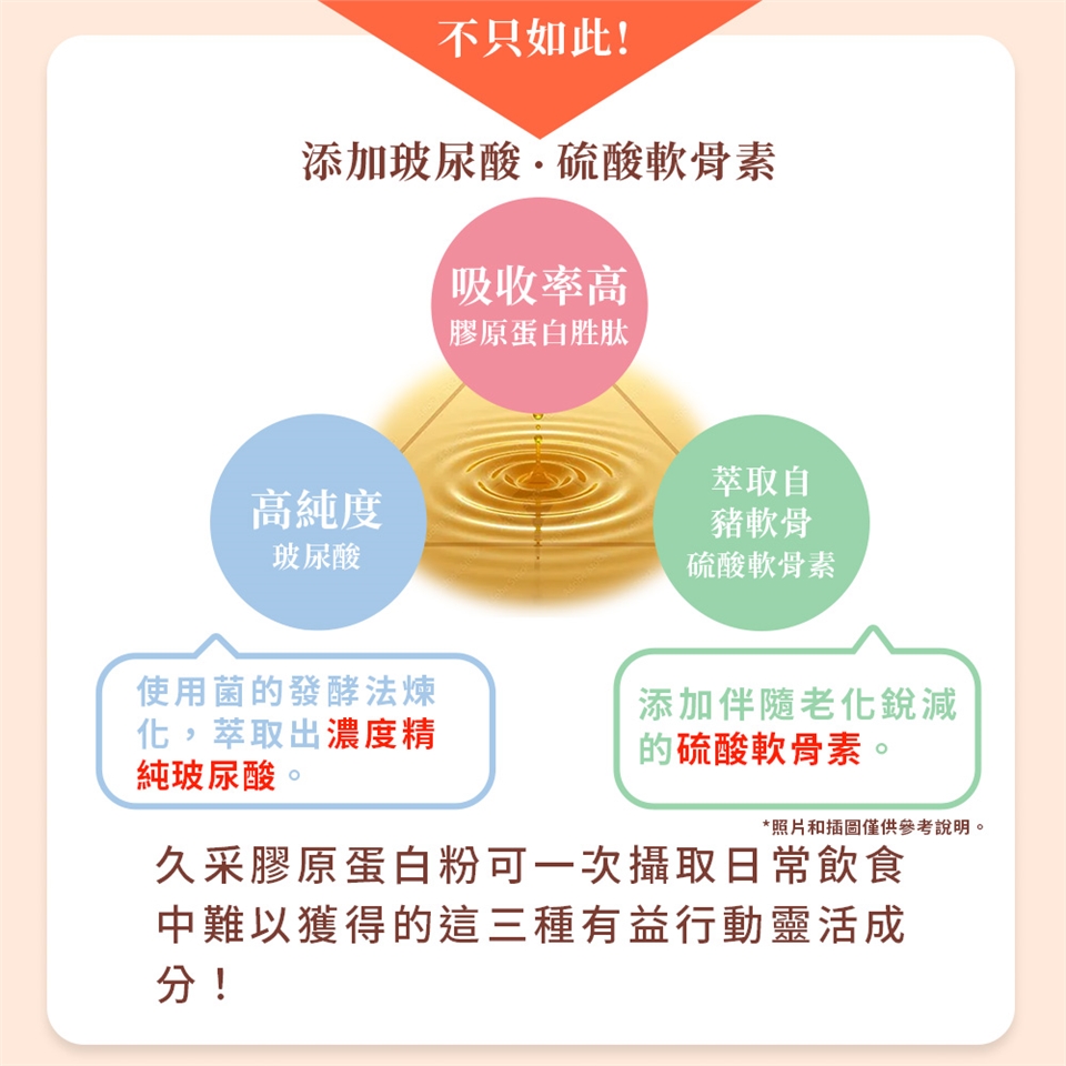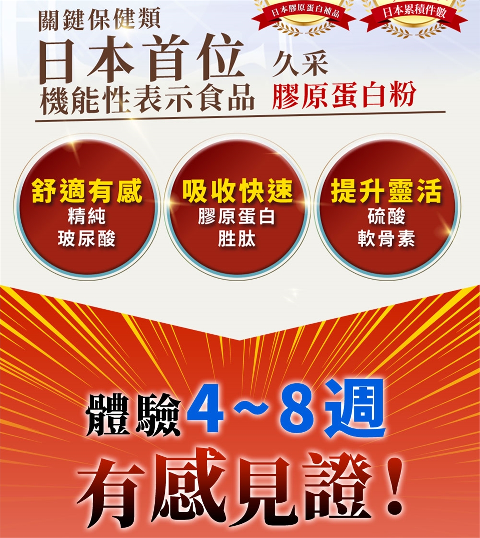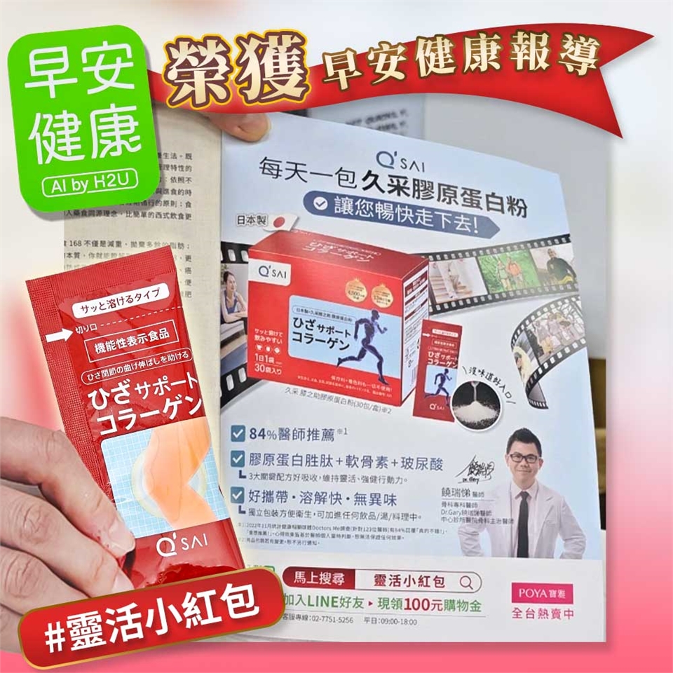 84%醫師推薦肯定,幫助行動靈活的順步關鍵成分是膠原蛋白,久采採用低分子膠原蛋白,比起日常生活中攝取能夠有效率被吸收,有助於維持健康體態,推薦使用!