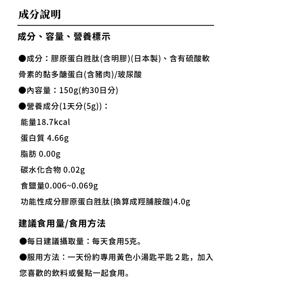 加在飲品或食物內食用,建議每天攝取2匙(約5g)