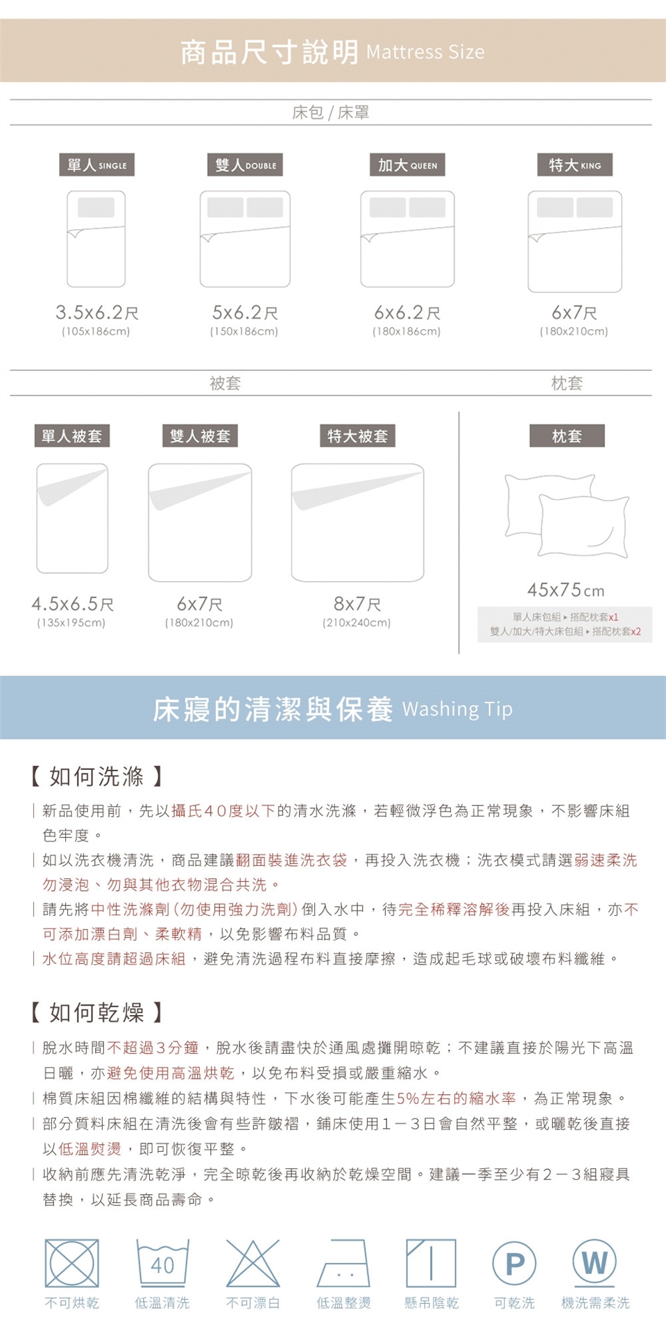 不可漂白、乾洗,並定期日曬達到消毒除溼效果