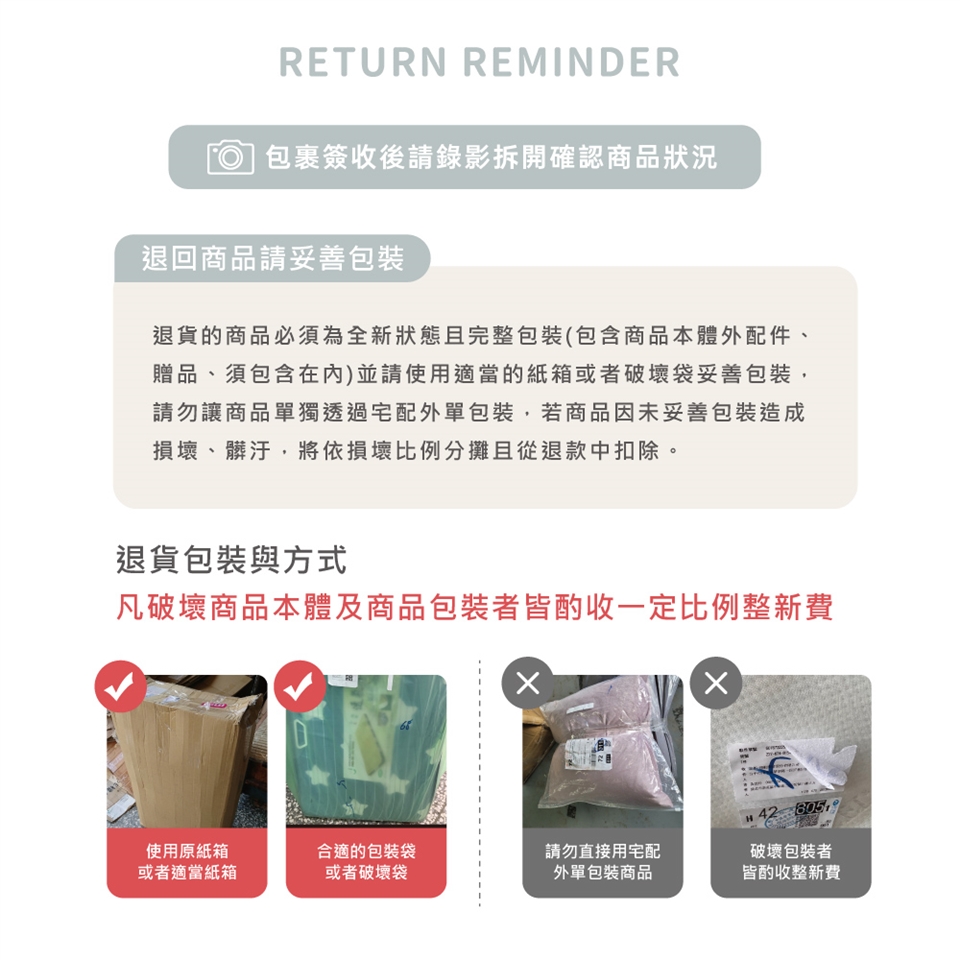 ※退貨的商品必須必須回復原狀,亦即必須回復至您收到商品時的原始狀態
